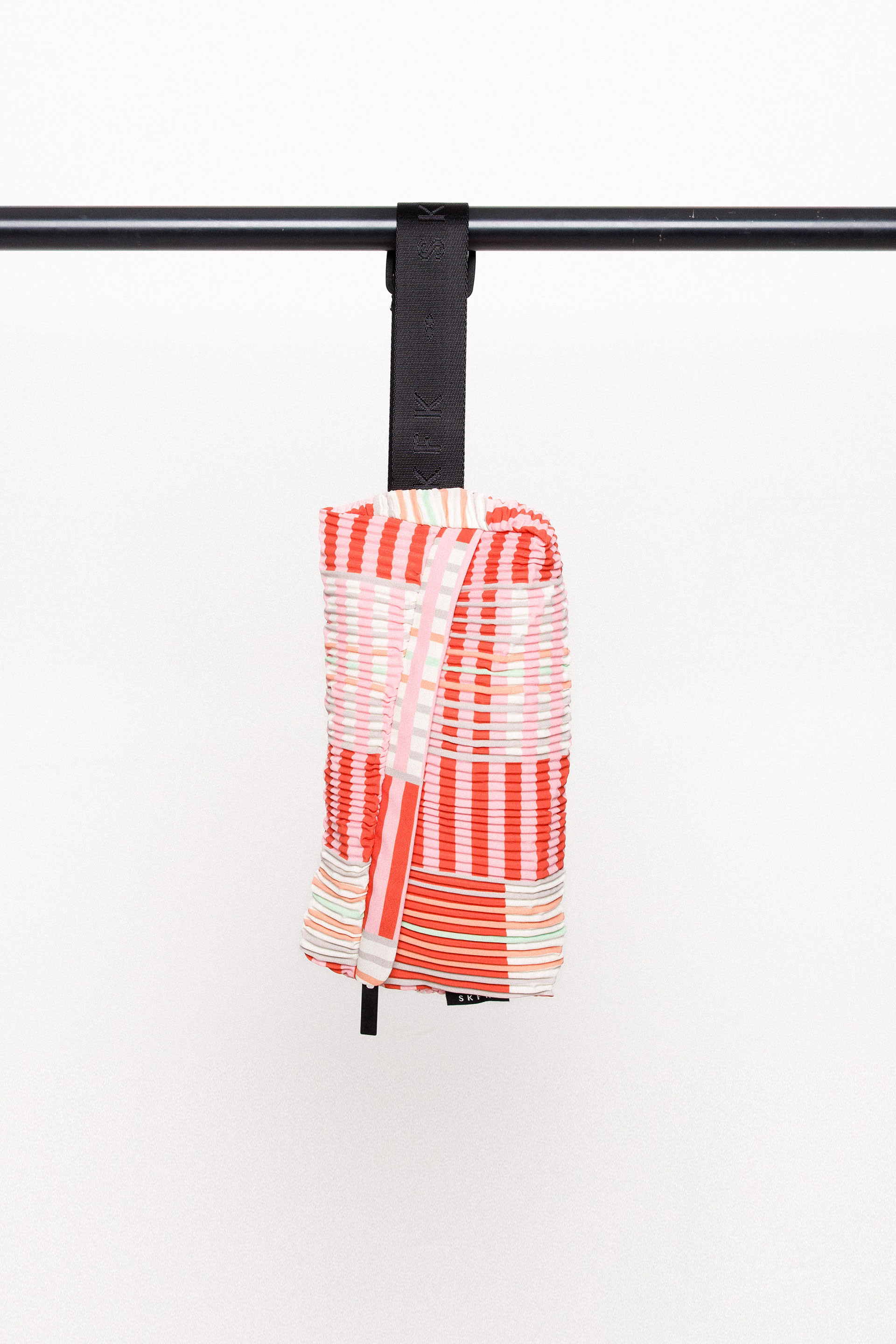 Gerriko poltsa zilindrikoa, zeharka tolestutako ehunezkoa. Kremailera ezkutua, nylonezko uhal doigarria eta ixteko presio-botoia. Neurriak: 25,5 x 14 x 5 cm.