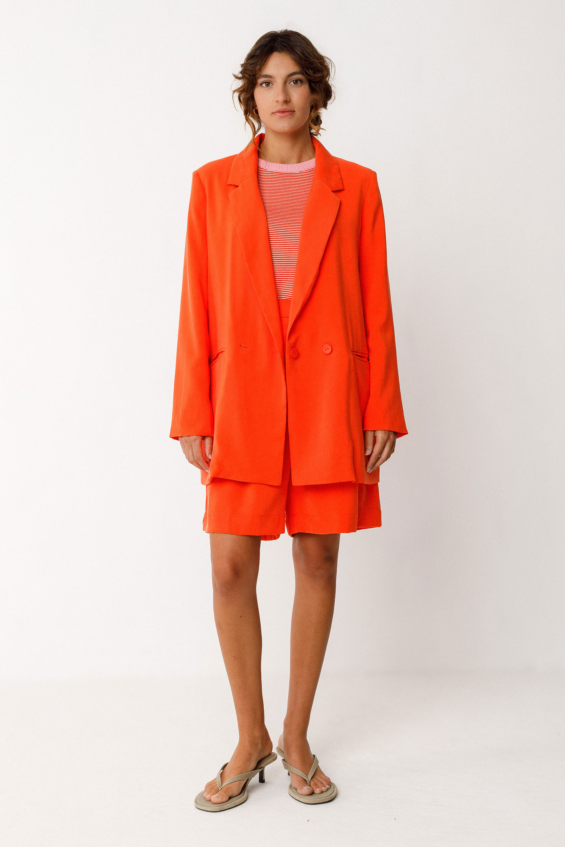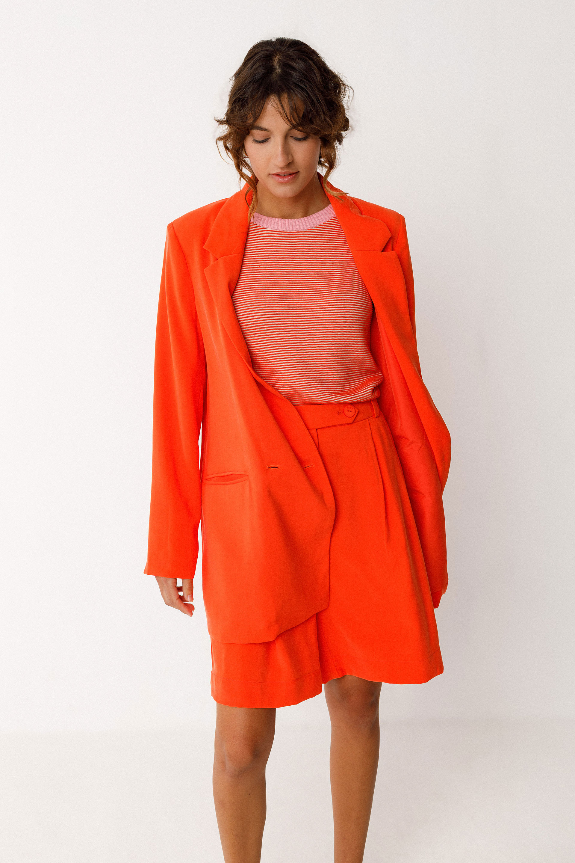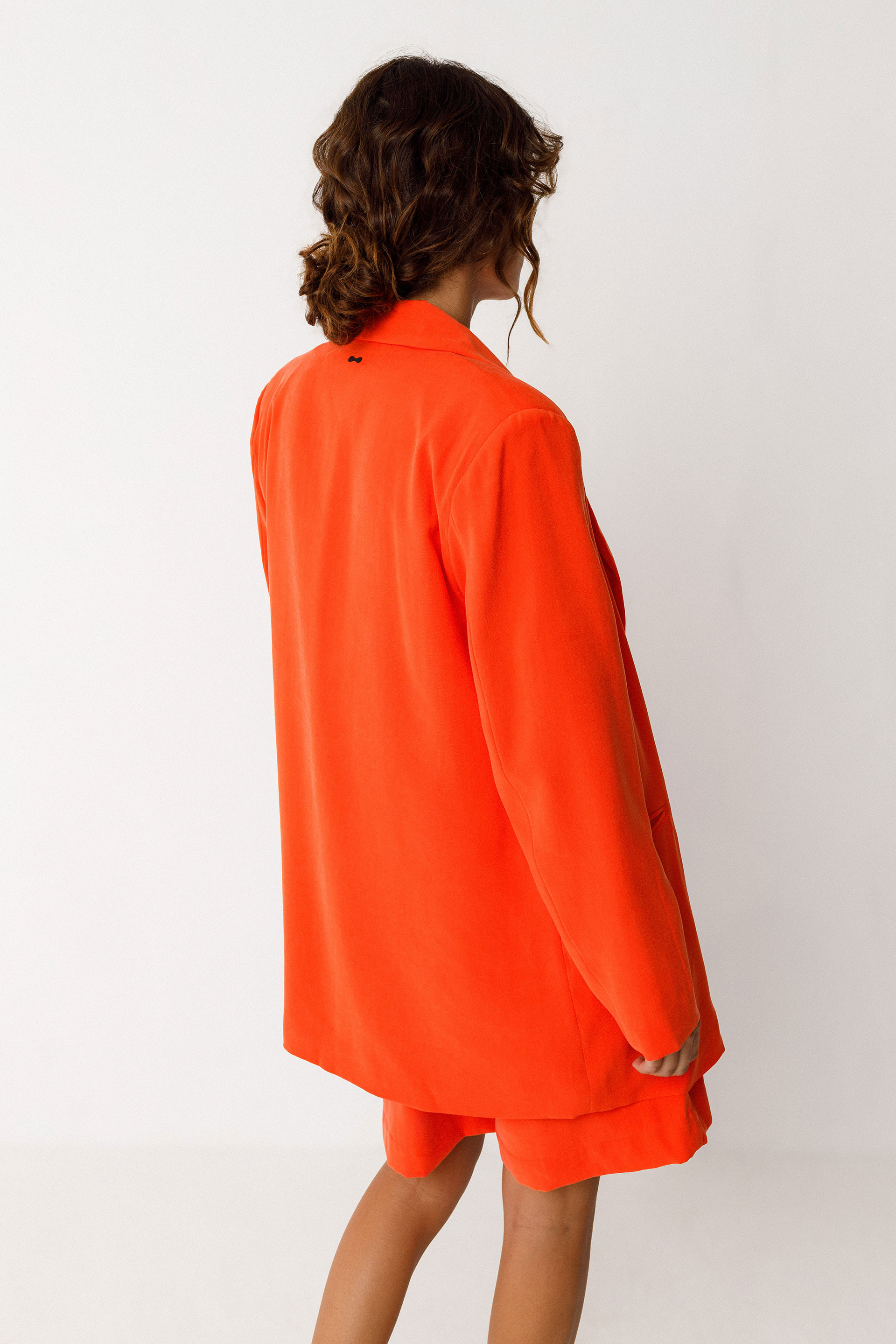 Blazer luzea eta zuzena. Mahuka luzea, jostun lepoa, ixteko botoiak eta poltsikoak aurrean. Guztiz forratua. Laranja kolorekoa.