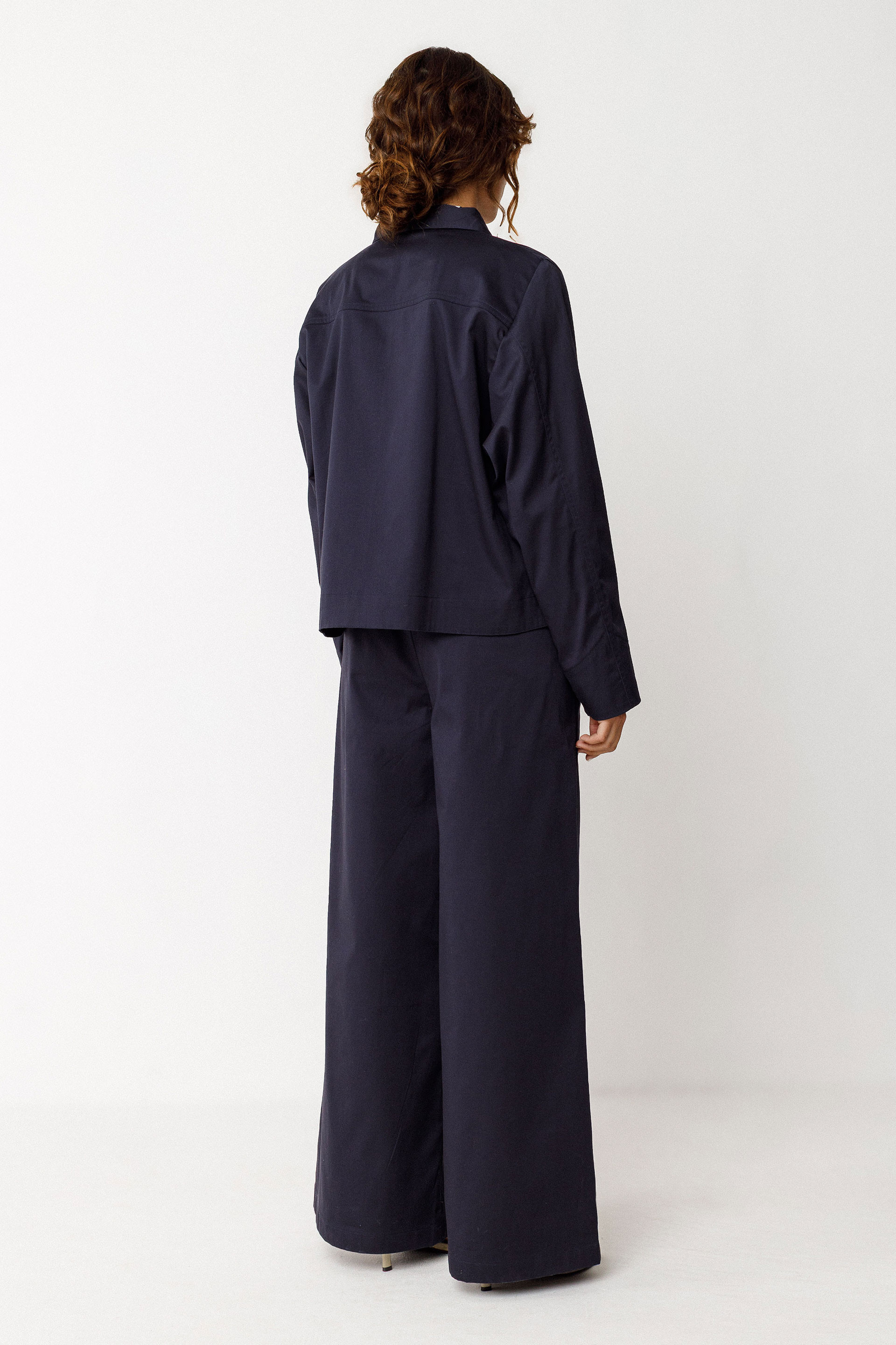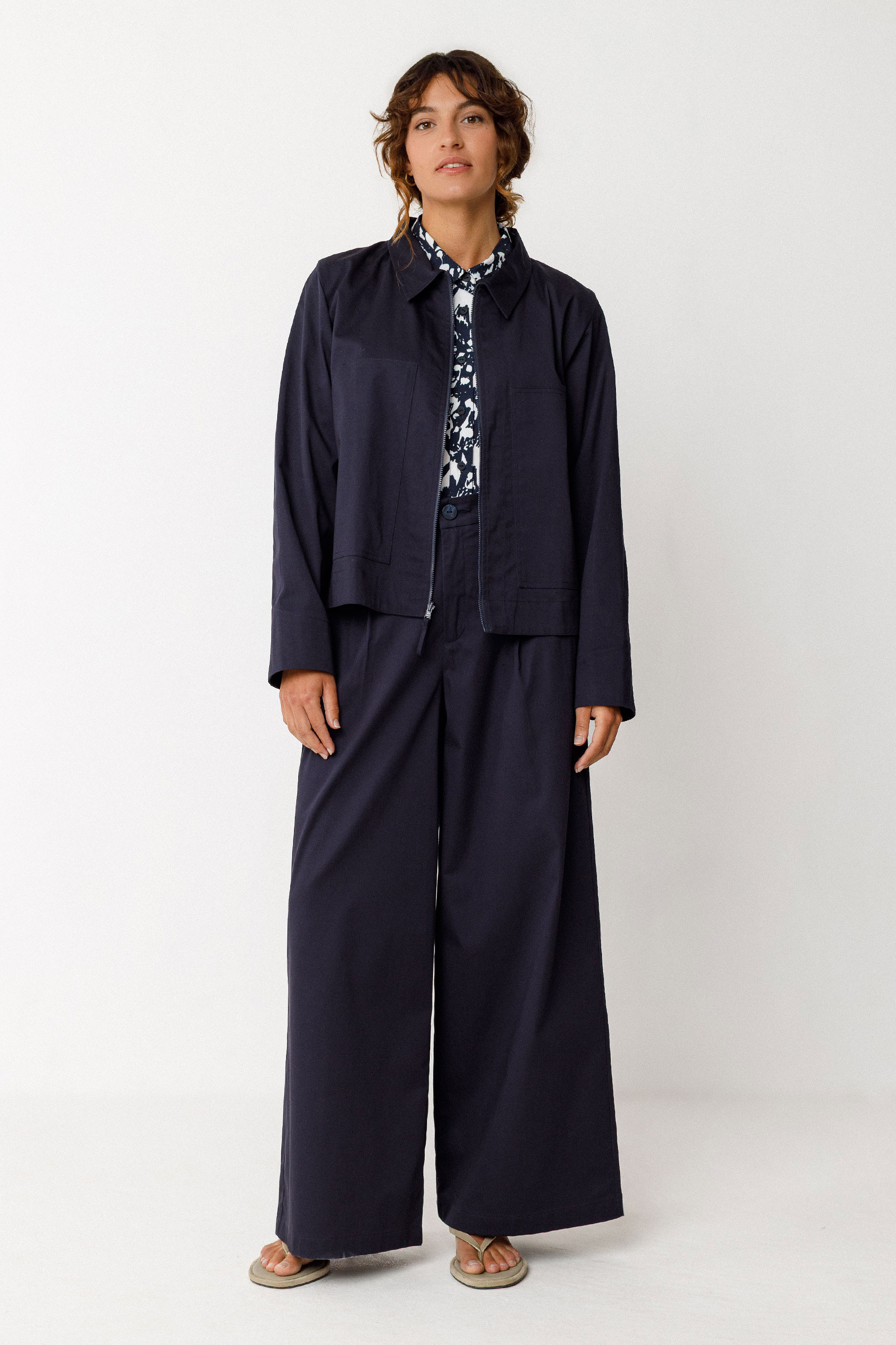Txaketa alderantzikagarri zabala. Lepo klasikoa, petatxu-poltsikoak eta ixteko kremailera aurrean.