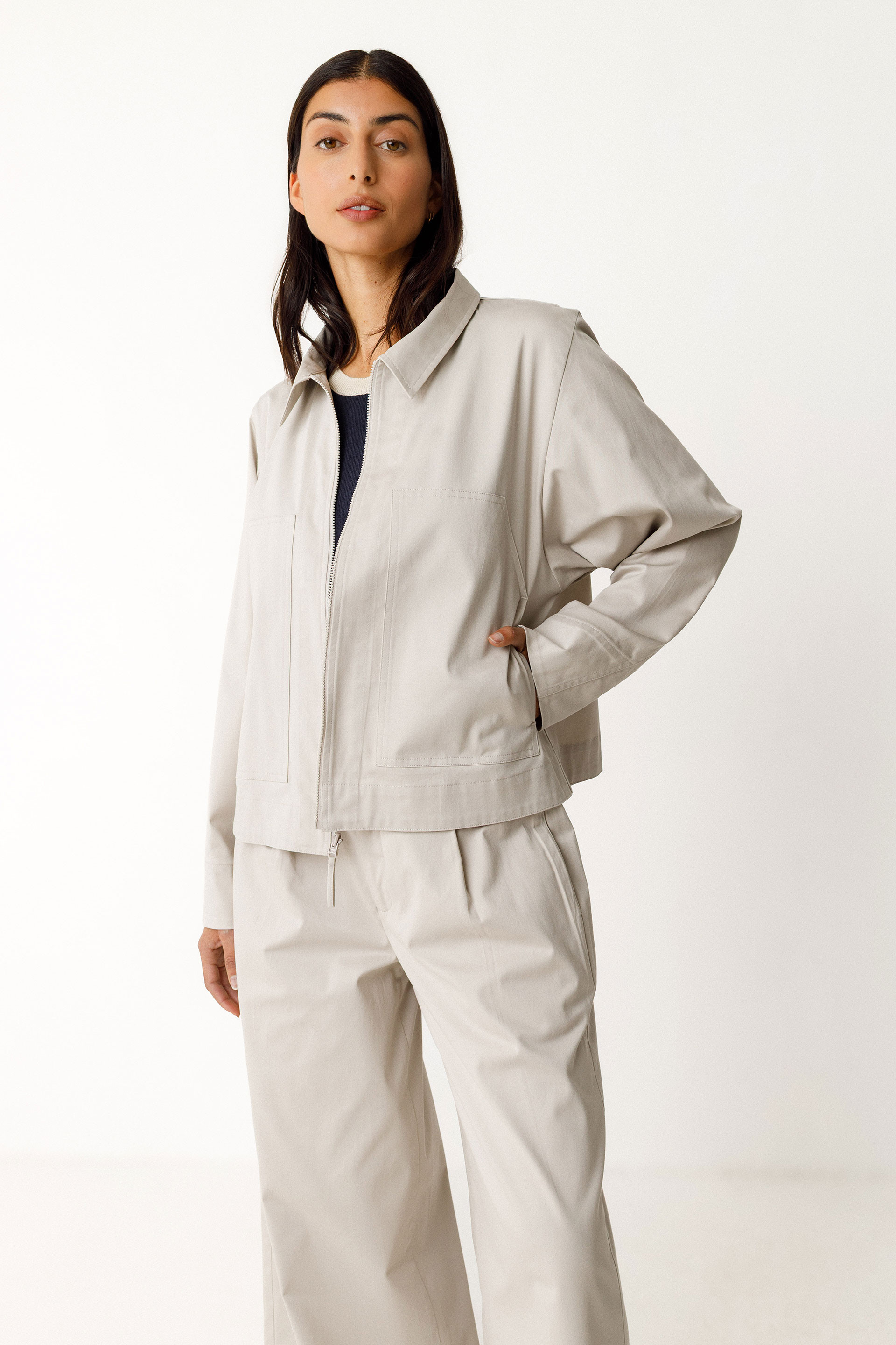 Txaketa alderantzikagarri zabala. Lepo klasikoa, petatxu-poltsikoak eta ixteko kremailera aurrean.