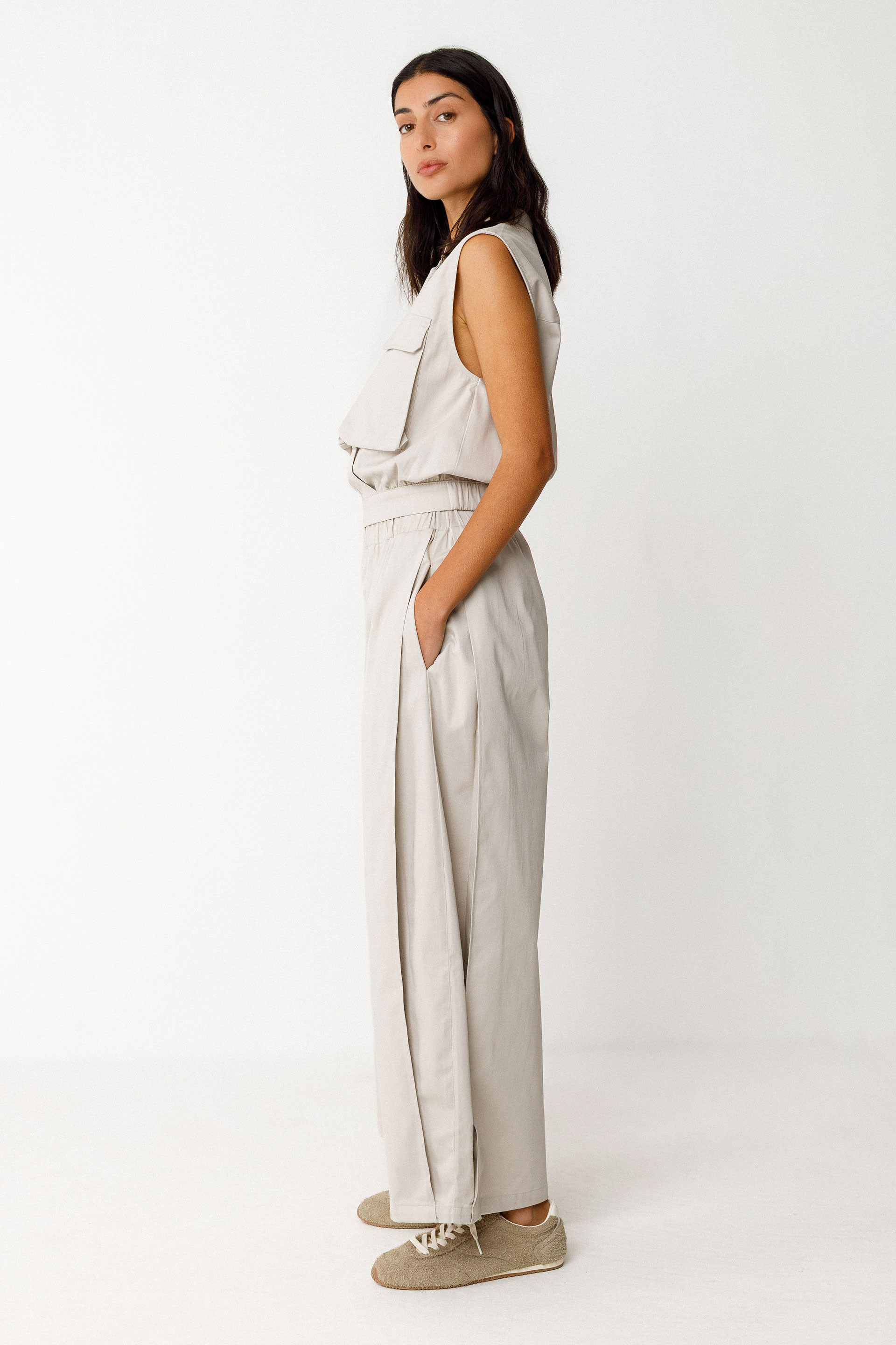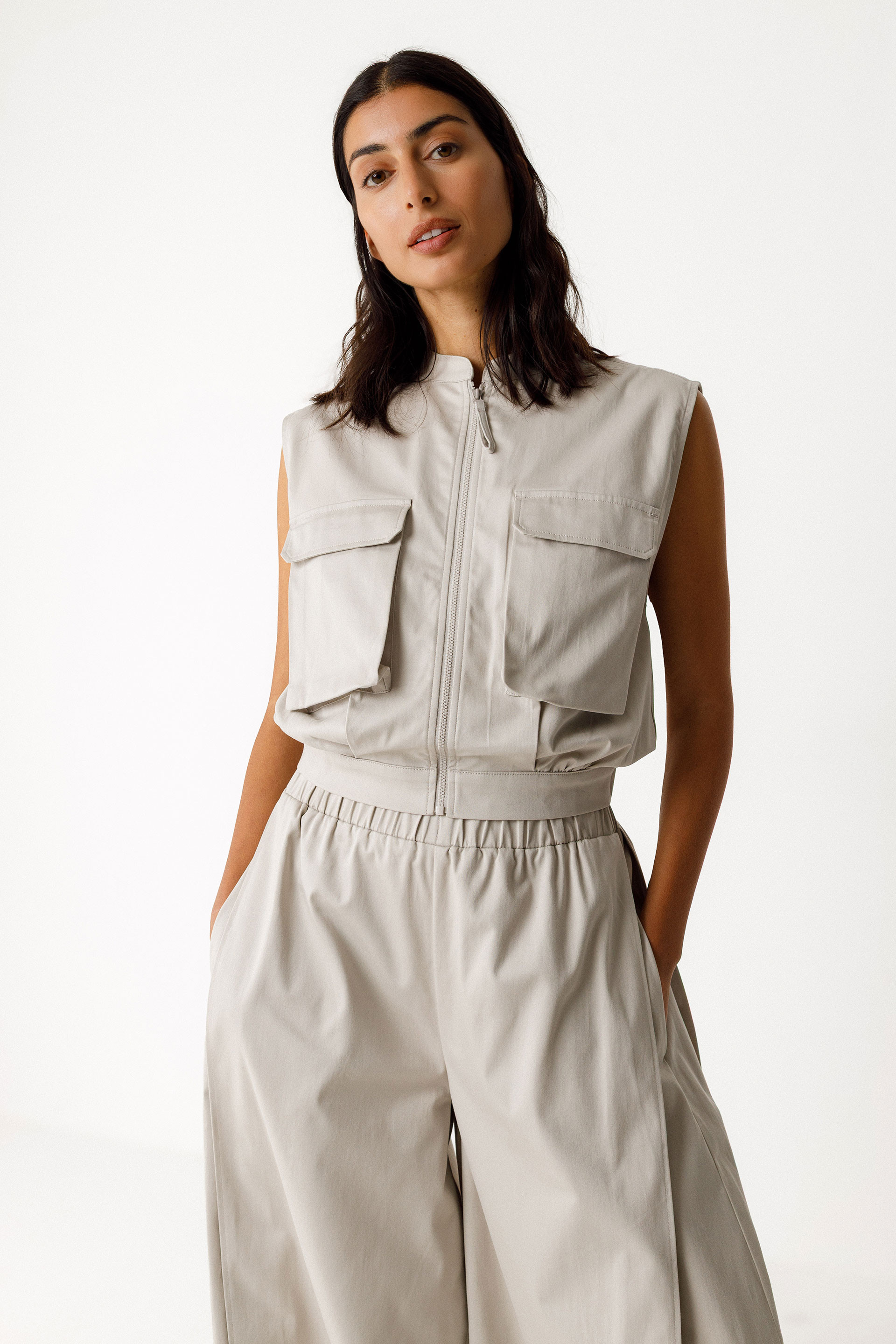 Top motza eta mahukagabea. Mao lepoa, militar estiloko bi poltsiko hegaldun eta ixteko kremailera aurrean. Gerri-zerrenda elastikoa bizkarrean.