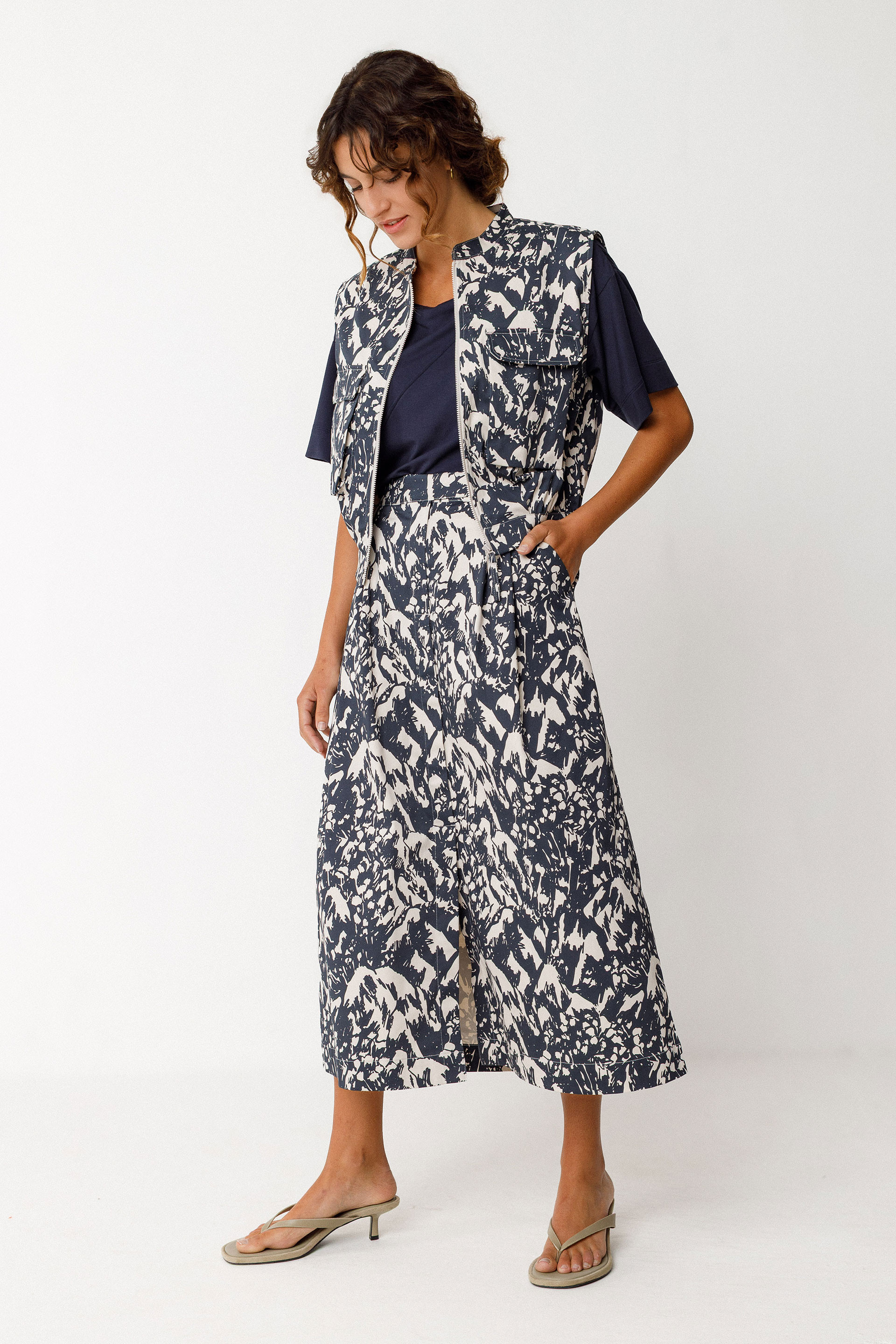 Midi gona barren-zabala. Kremaileradun brageta aurrean, poltsikoak alboetan eta irekidura aurrealdean, erdian.