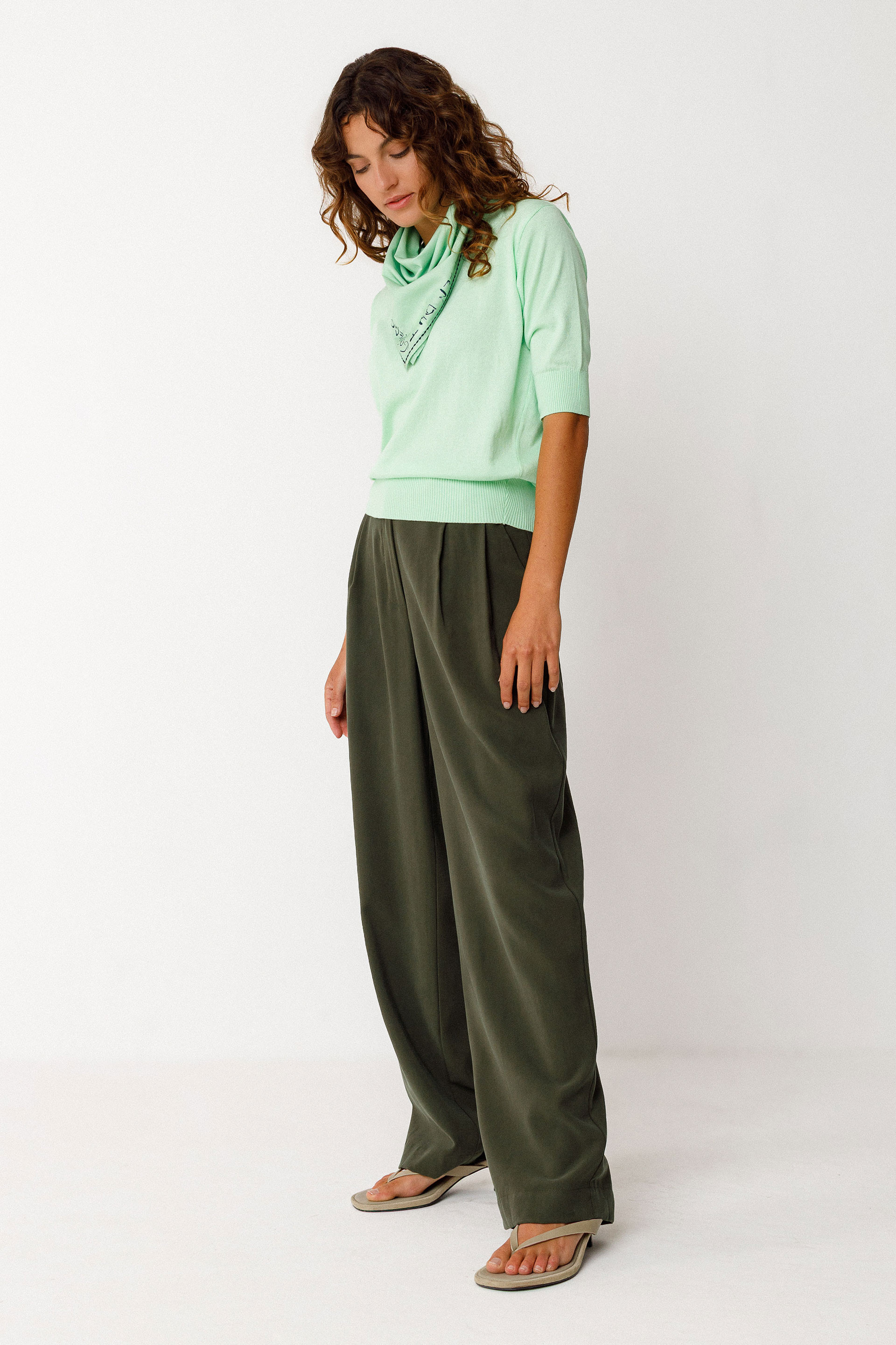 Bi koloreko jertsea, kotoi organikoko puntu arinezkoa (GOTS ziurtagiria). Lepo biribila, hiru laurdeneko mahuka eta kanalezko erremateak lepoan, eskumuturretan eta gerrian. Efektu testurizatua.