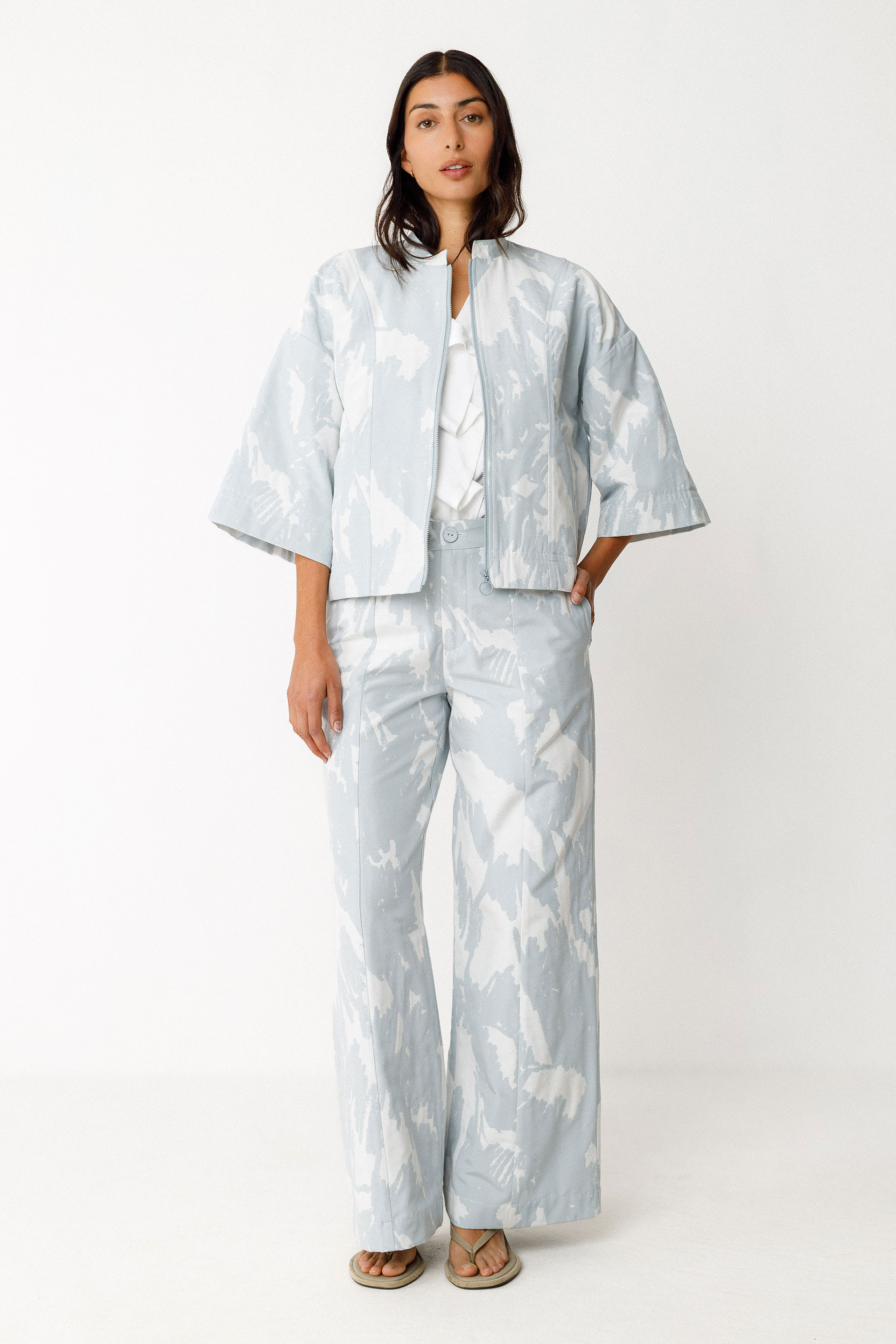 Galtza egituratu zuzenak. Gerri klasikoa, barruko gerri-zerrenda egituratua, ixteko kremaileradun brageta eta poltsiko azpilduak. Efektu drapeatua aurrealdean. Luzera osoa 38 neurrian: 105 cm.