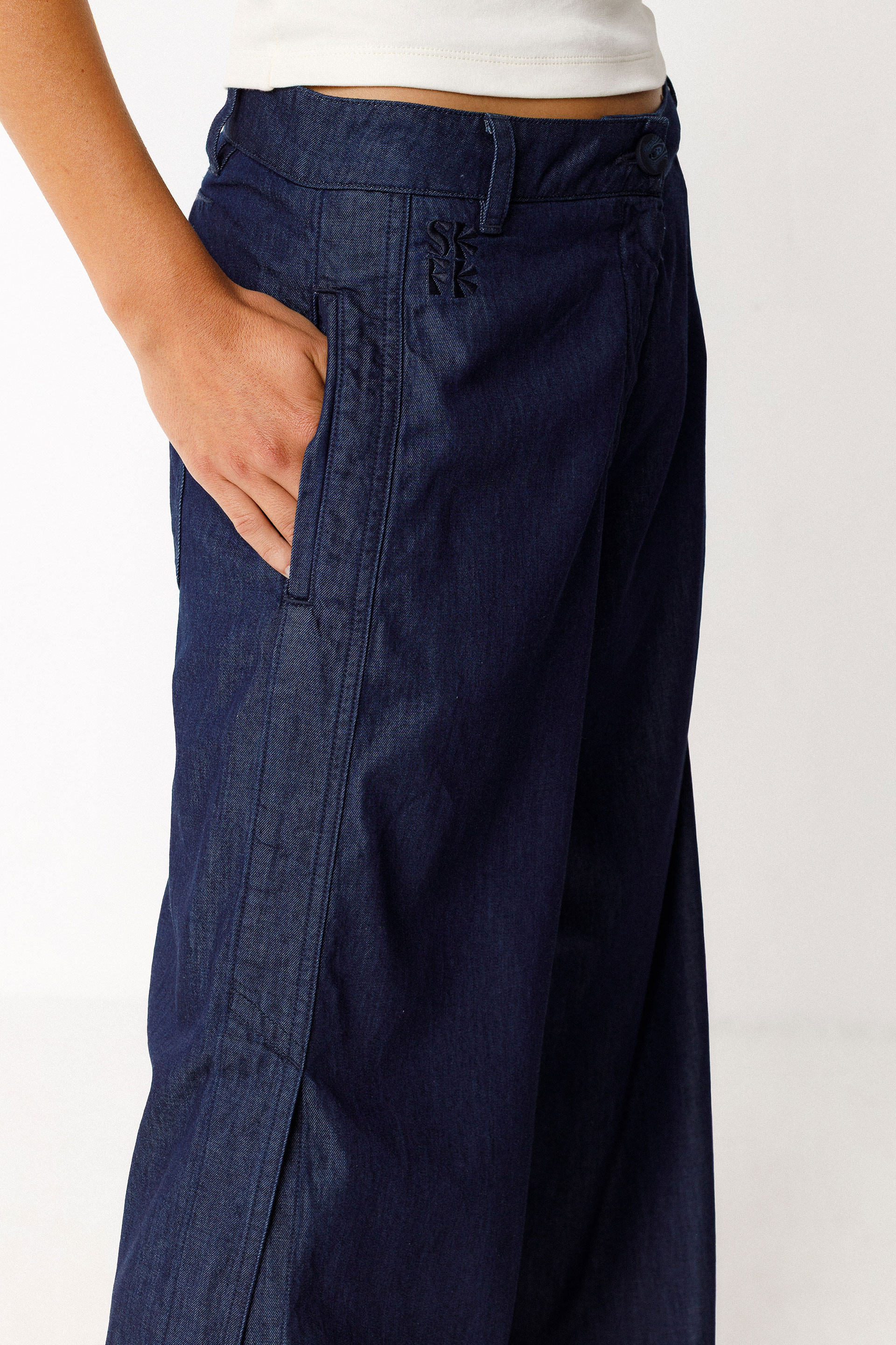 Hanka zabaleko galtza bakeroak, kotoi organikozkoak (GOTS ziurtagiria). Irekidurak alboetan, gerri klasikoa, ixteko kremailera aurrean eta poltsikoak alboetan. Luzera osoa 38 neurrian: 100 cm.