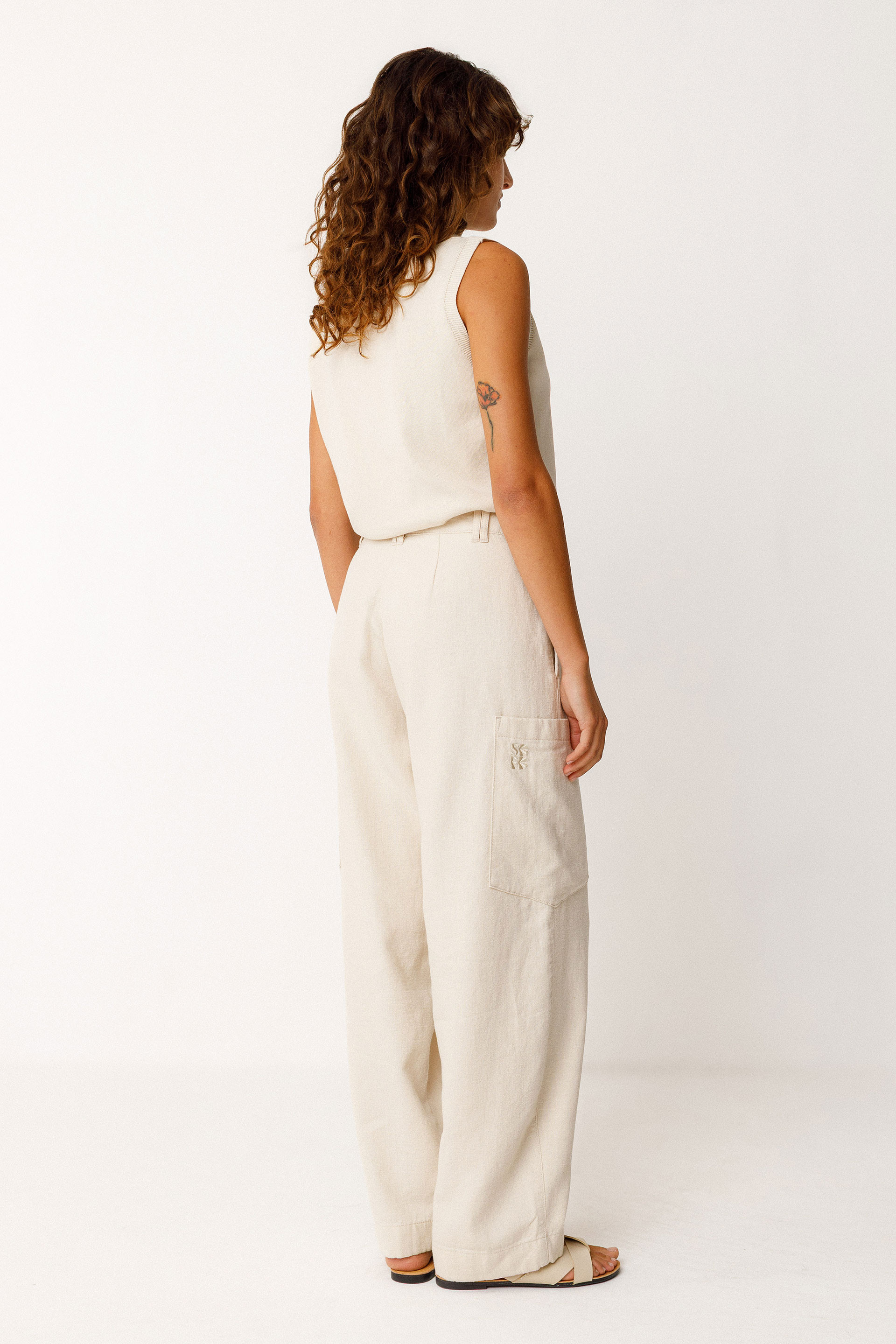 Orkatilarainoko galtza zabalak, liho eta kotoi organikozkoak. Kremaileradun brageta aurrean, poltsikoak alboetan eta petatxu-poltsikoak izterretan. Luzera osoa 38 neurrian: 100 cm.