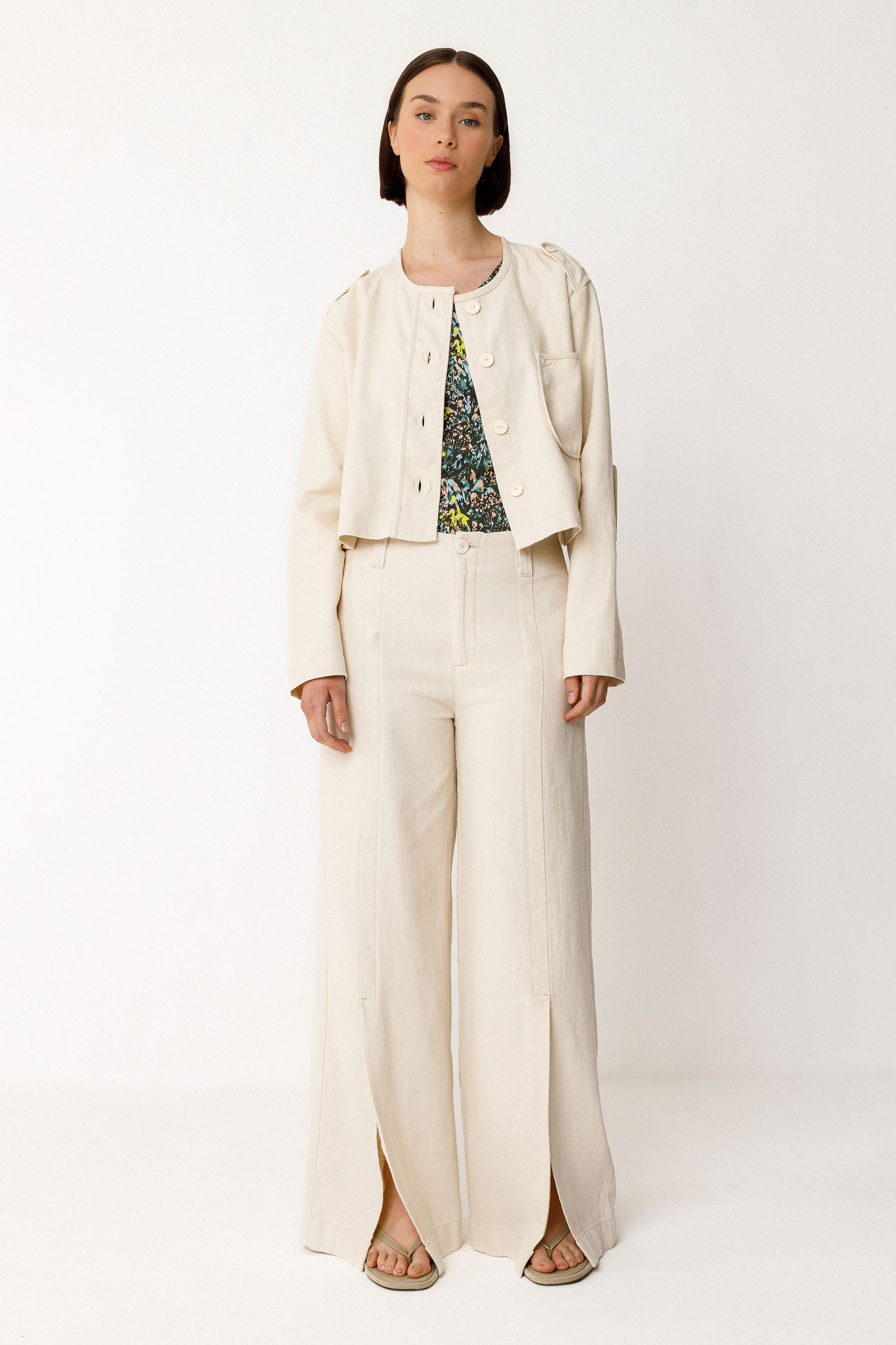 Palazzo galtzak, liho eta kotoi organikozkoak. Gerri altua, kremaileradun brageta aurrean eta poltsikoak alboetan. Zangoek irekidura bana dute aurrealdean. Luzera osoa 38 neurrian: 106 cm.