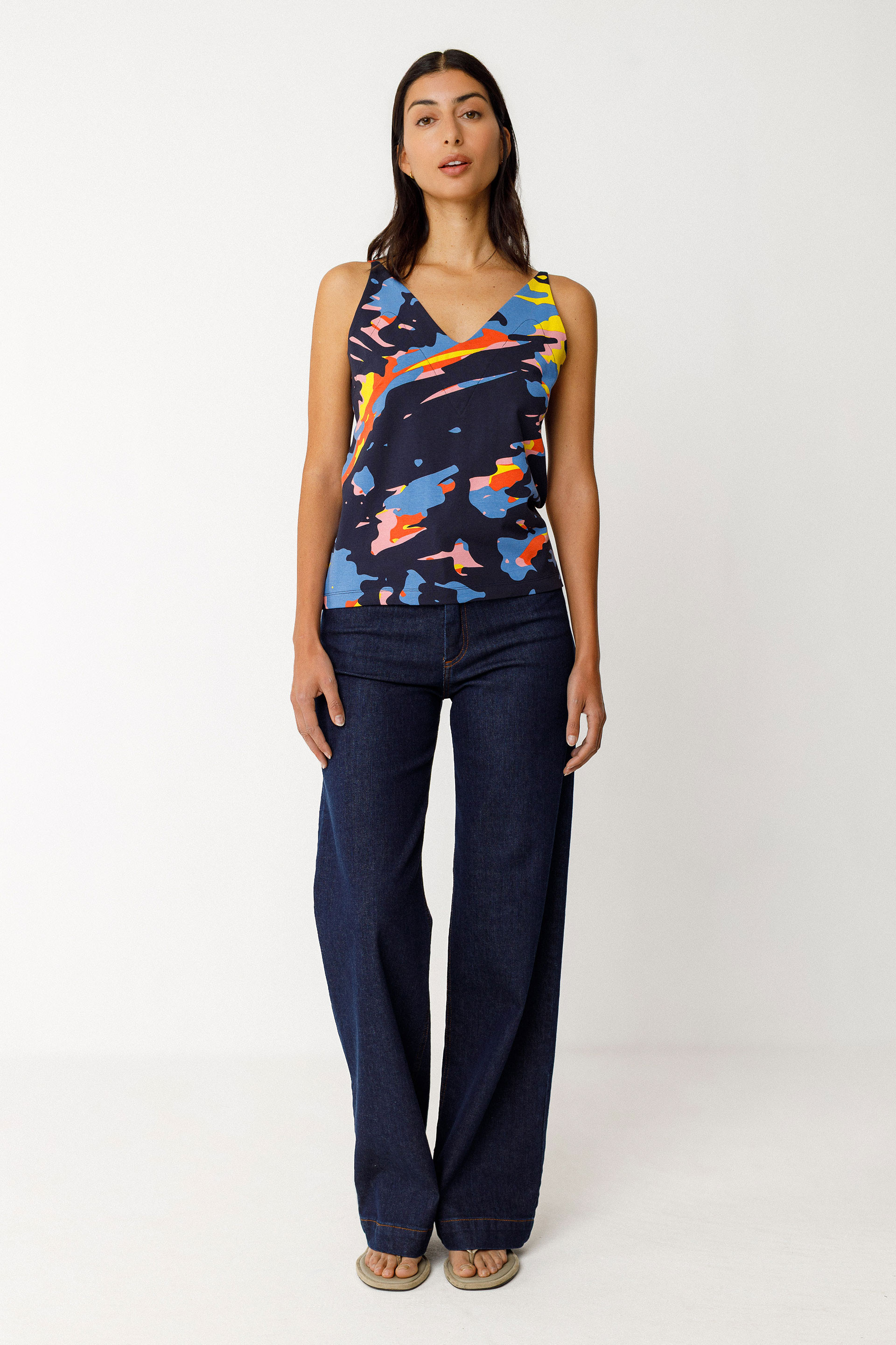 Kamiseta tiranteduna eta zuzena, kotoi organikozkoa (GOTS ziurtagiria). Lepo puntaduna.