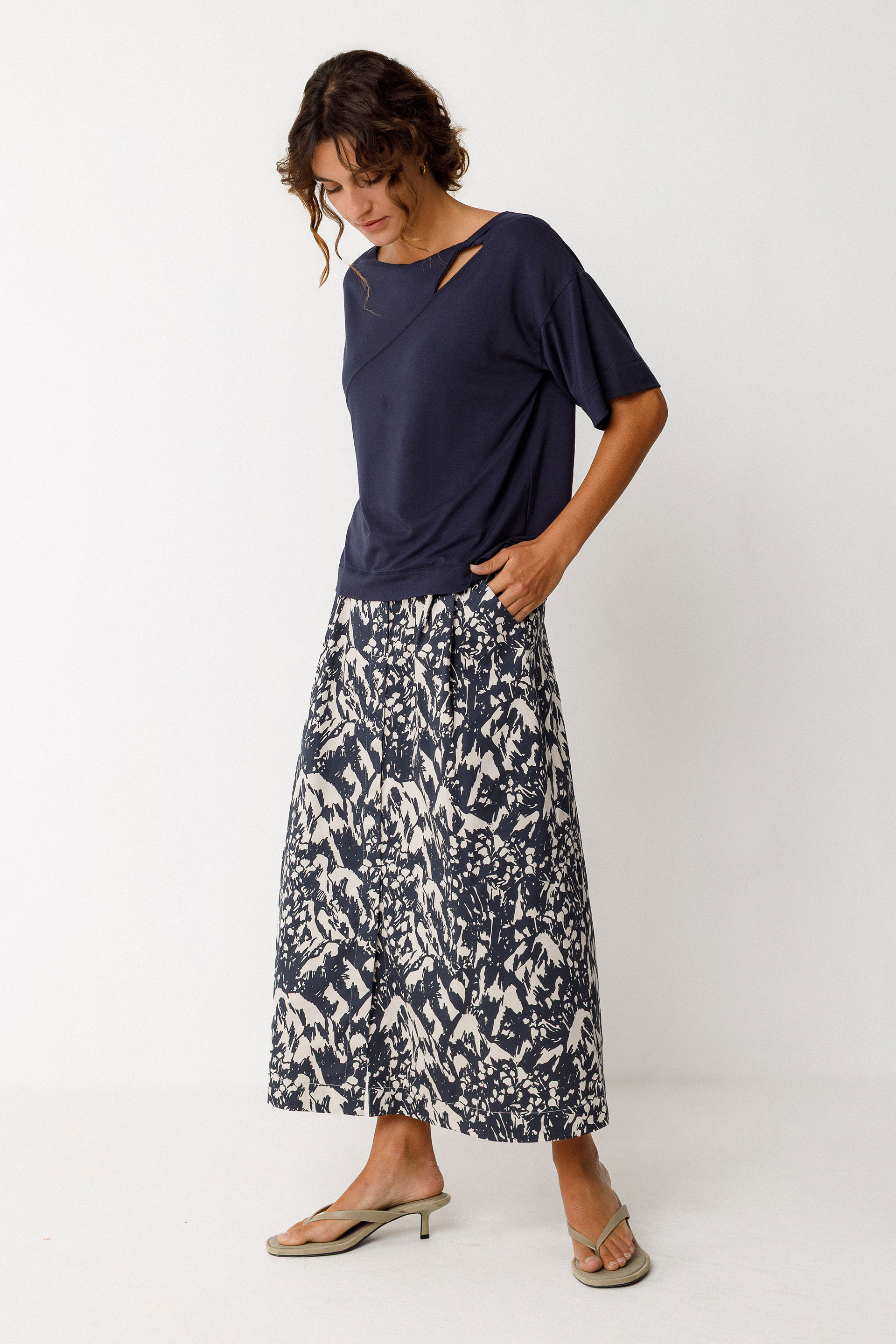 Kamiseta zabala eta mahuka motza. Itsasontzi-formako lepoa eta korapilo apaingarria aurrean.