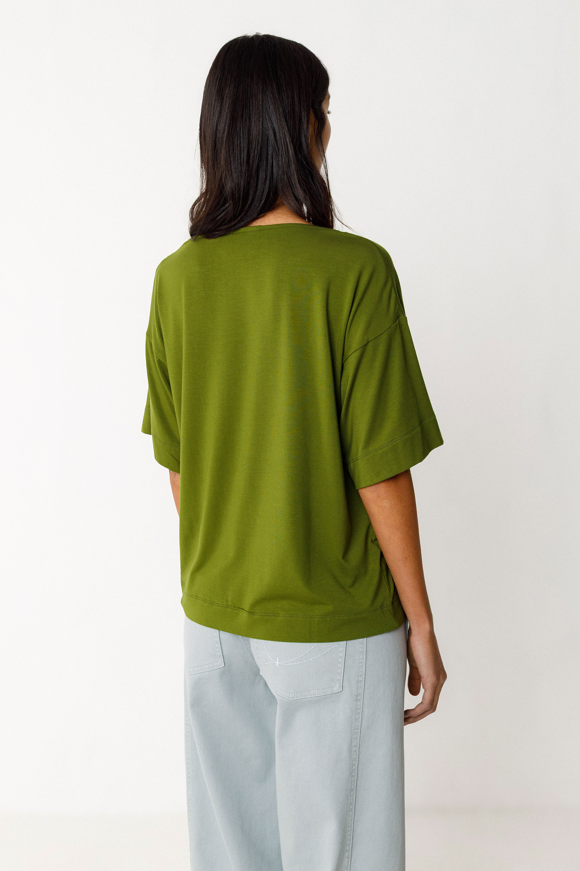 Kamiseta zabala eta mahuka motza. Itsasontzi-formako lepoa eta korapilo apaingarria aurrean.
