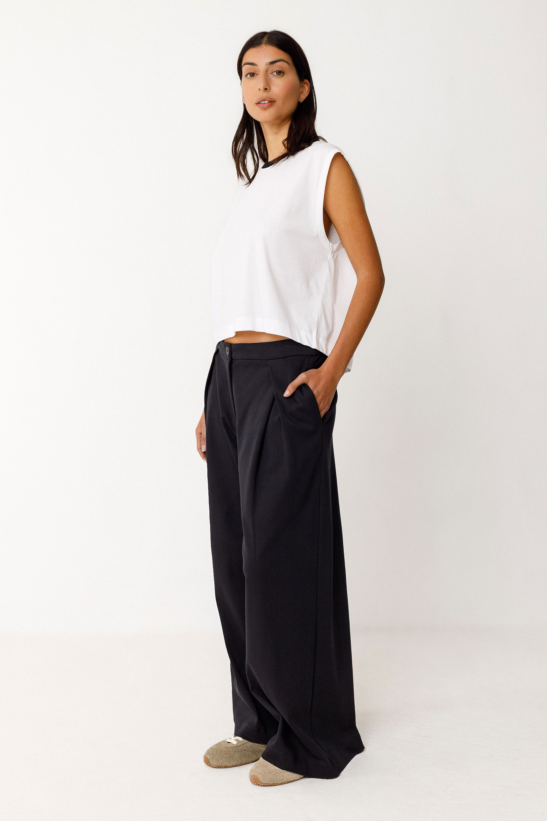 Kamiseta lasaia. Mahukagabea eta karratua. Kontraste egiten duen kanale-puntuzko erremate batekin apaindutako lepo biribila.