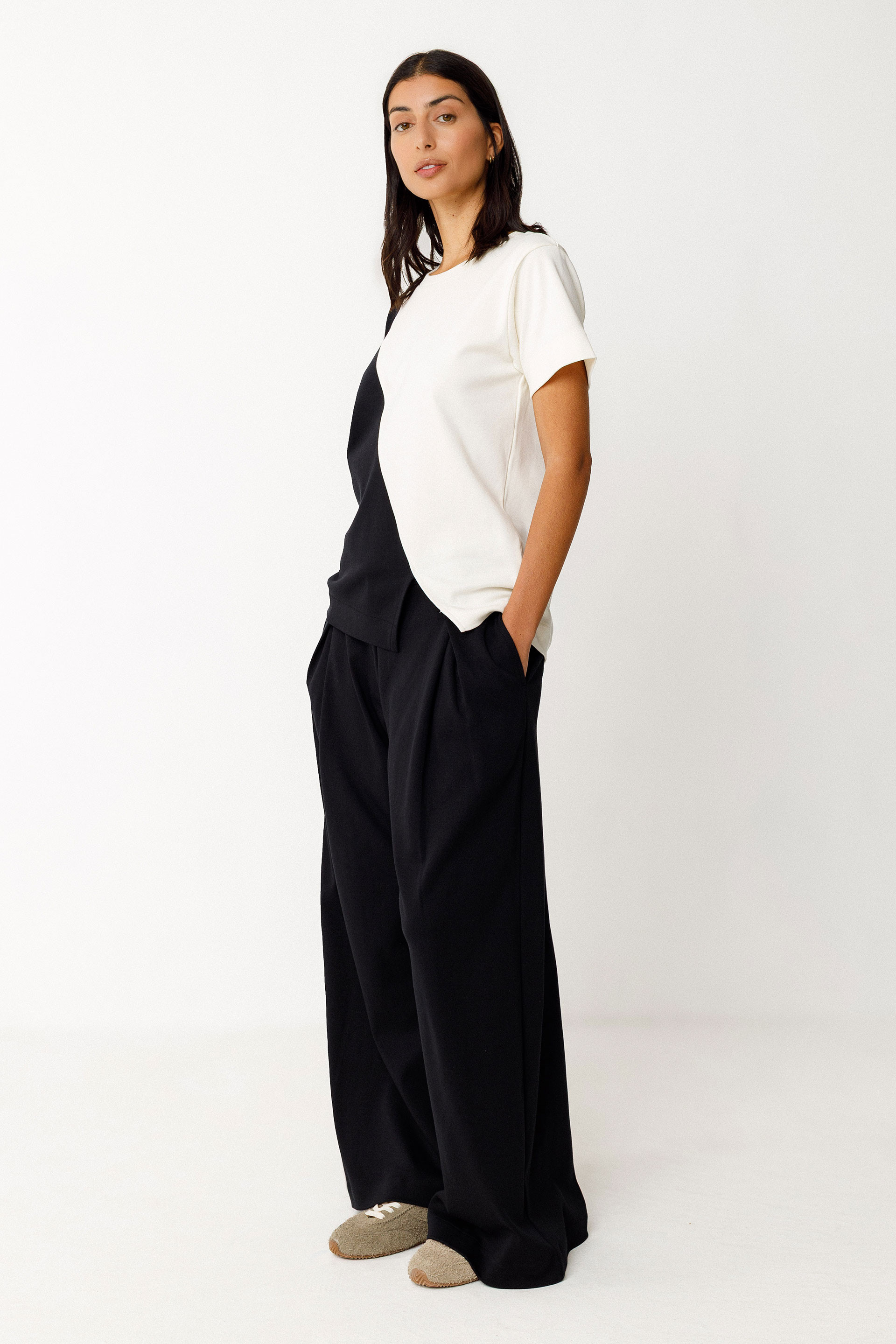 Kamiseta zuzena. Mahuka motza eta lepo biribila. Color block efektua.