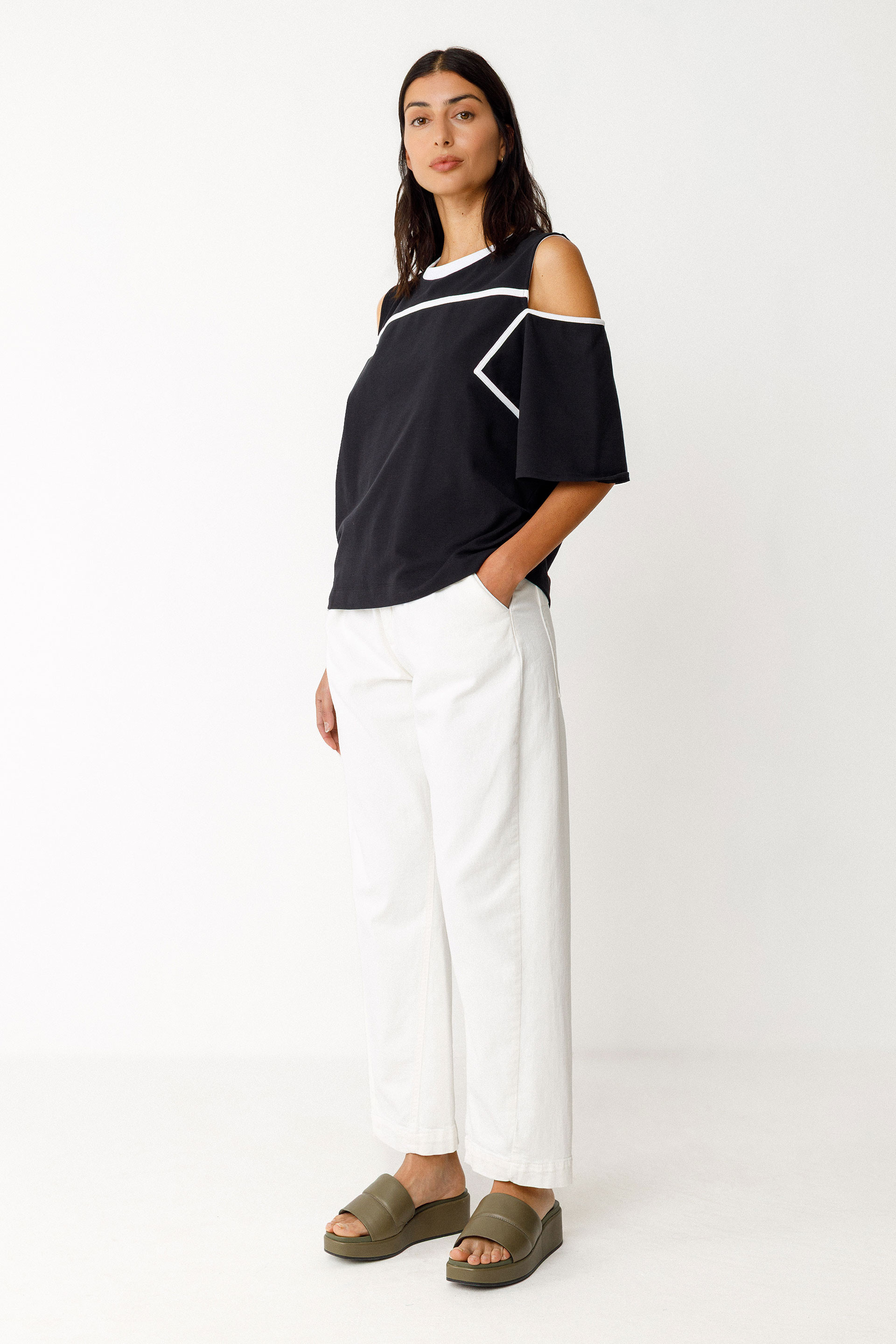 Kamiseta zabala. Mahuka motza eta lepo biribila. Kontraste egiten duen atzera-puntada batekin apaindutako irekidura txikiak sorbaldetan.