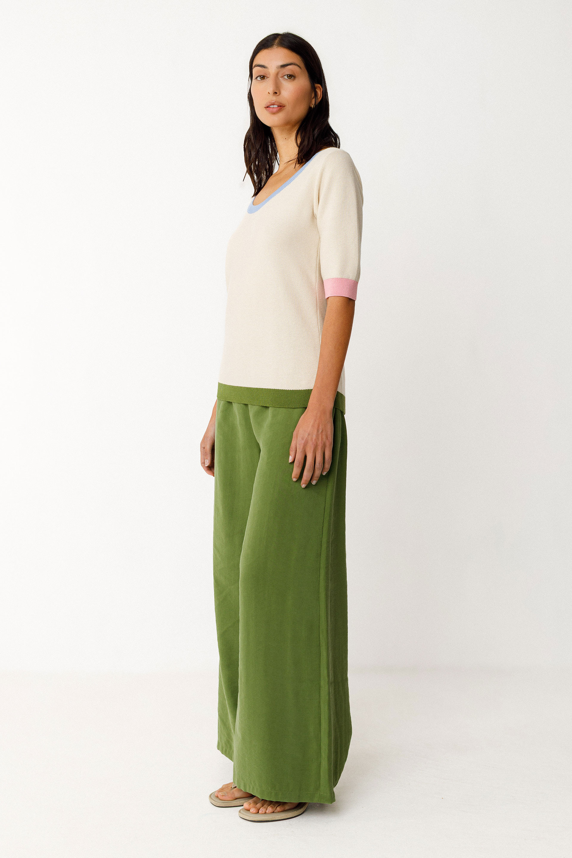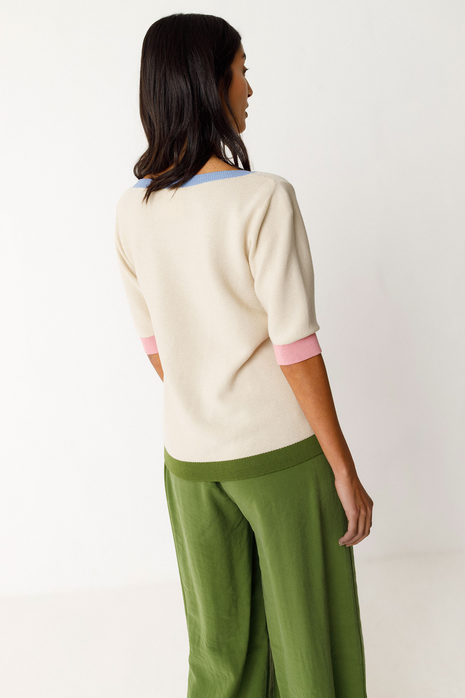Kamiseta mahuka motza eta zuzena, kotoi organikoko puntu arinezkoa (GOTS ziurtagiria). Eskote biribila.