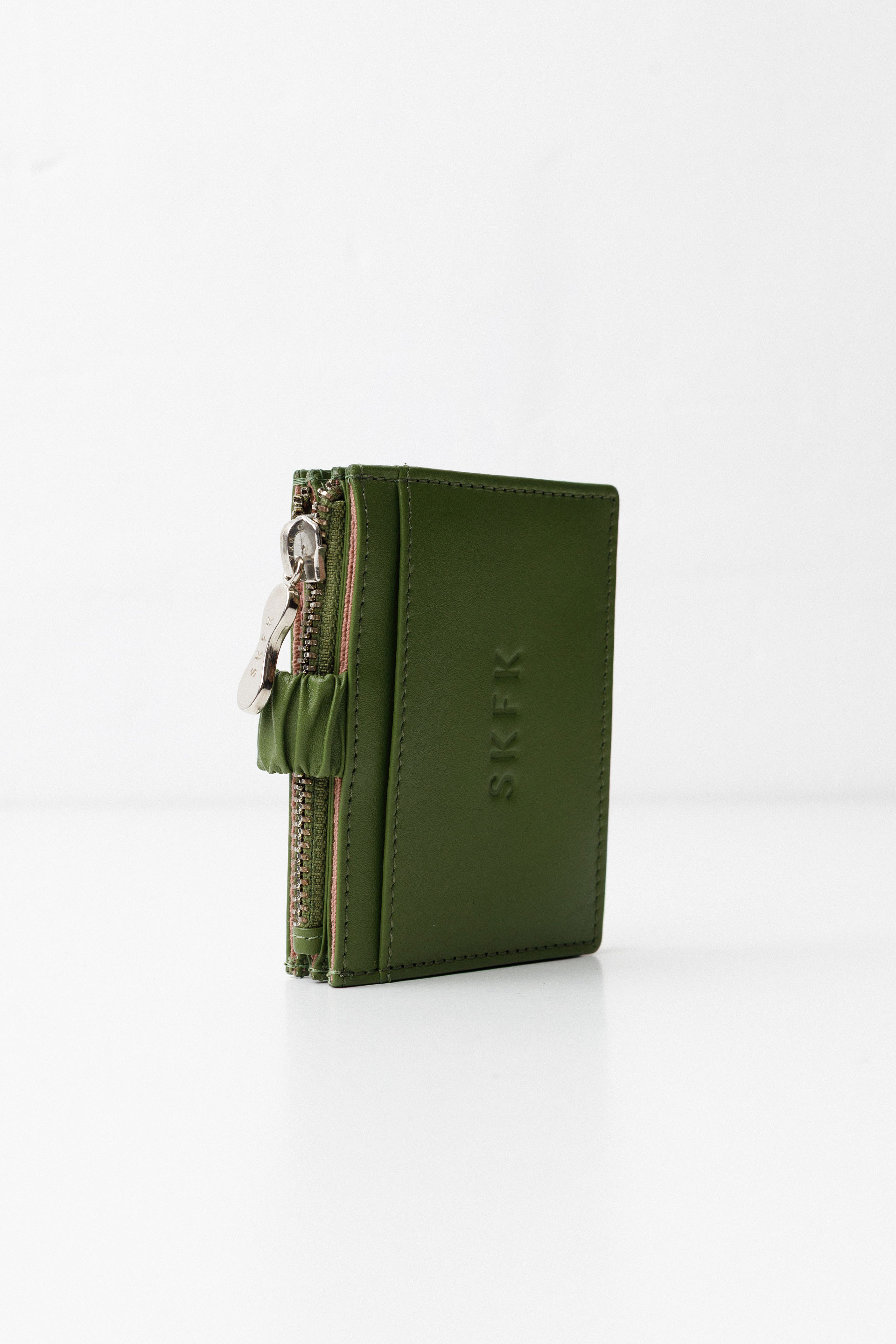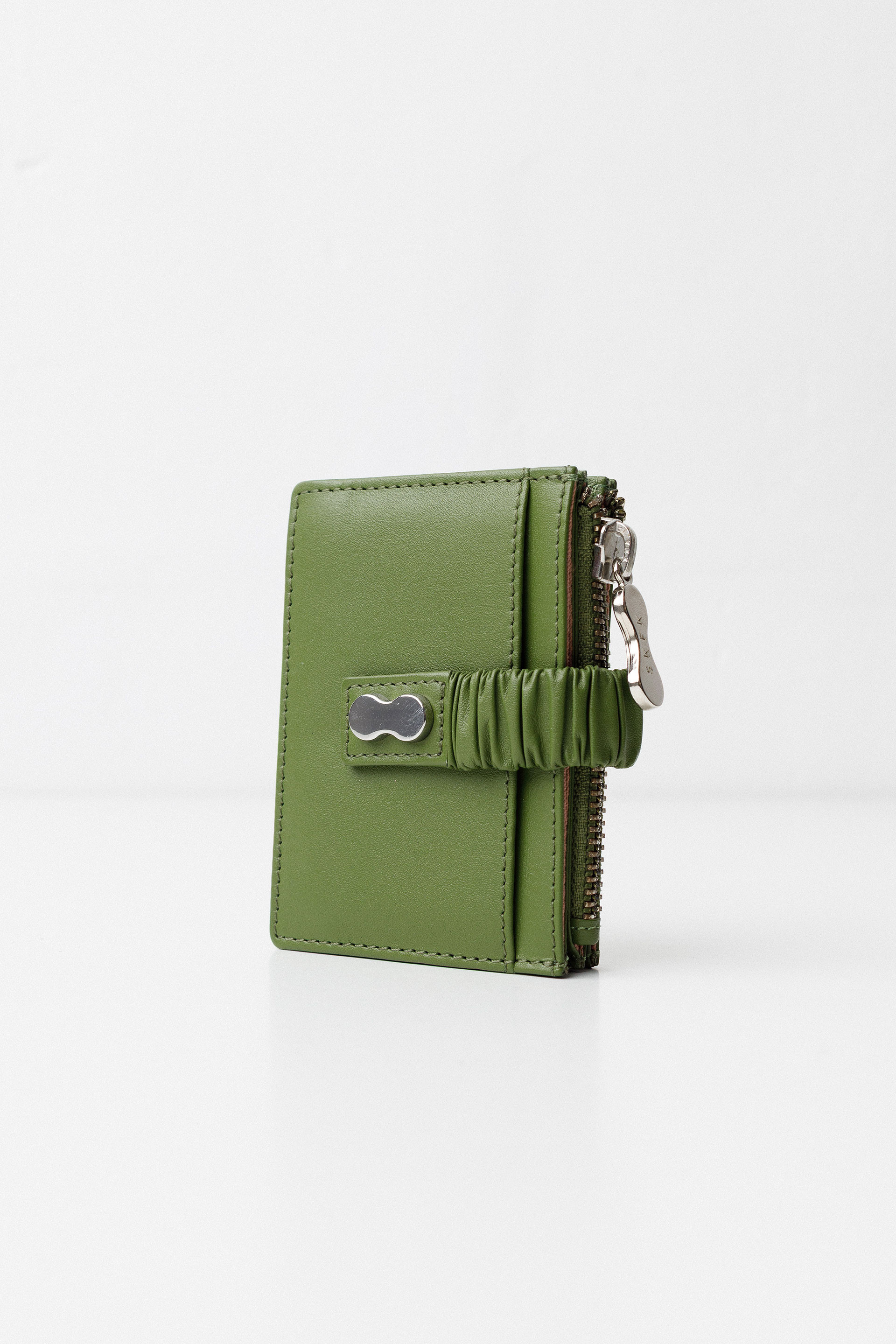 Larruzko zorroa. Ixteko kremailera eta botoia. Izurdun uhala. Txartelak eta billeteak gordetzeko poltsikoa. Neurriak: 10 x 7 cm.