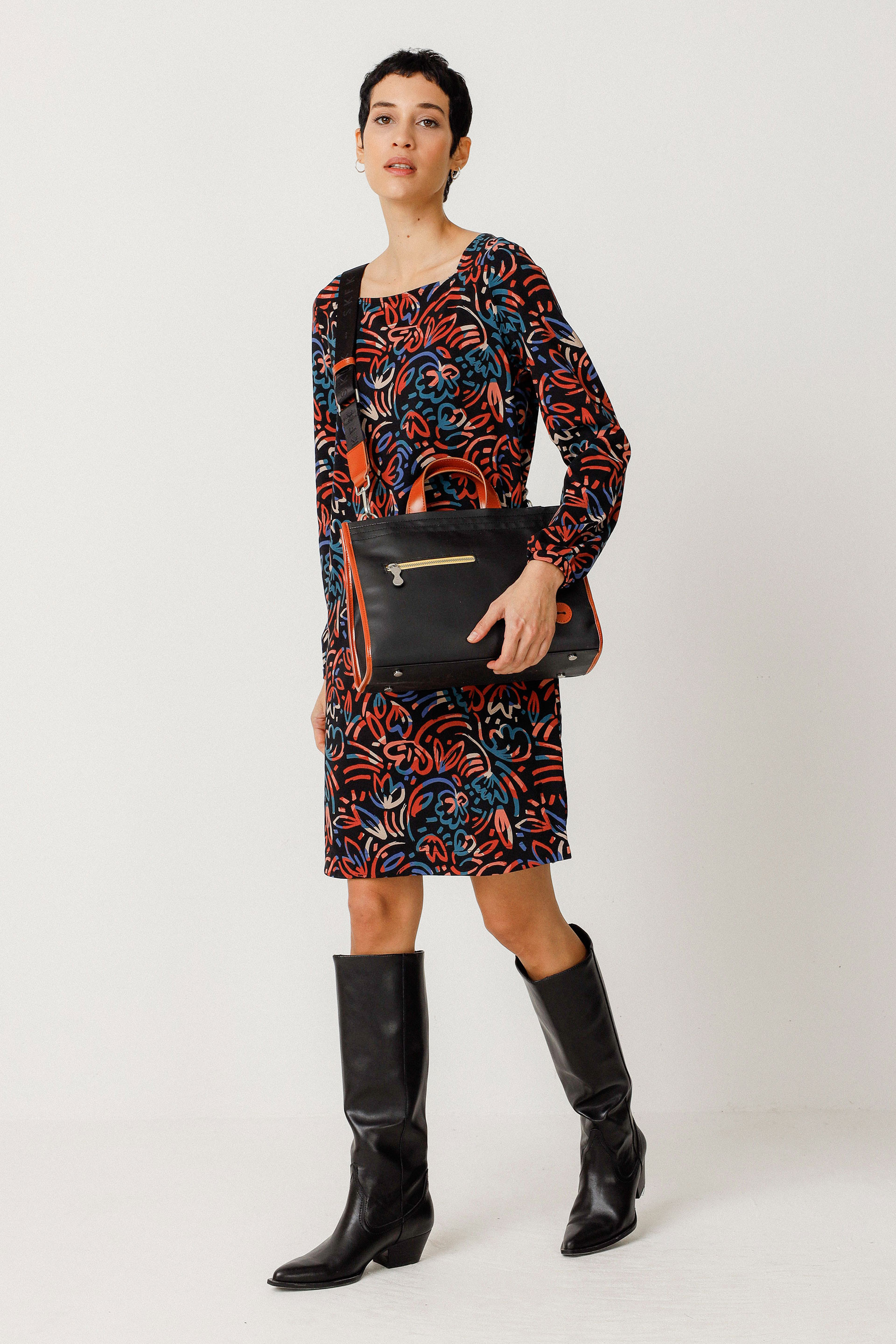 Larruzko eta kotoi birziklatuzko shopper poltsa. Poltsikoak aurrean eta atzean, uhal doigarri eta desmuntagarria, ixteko kremailera eta neurria doitzeko presio-botoiak. Beste poltsiko bat barruan eta forru estanpatua. Neurriak: 330 x 240 x 140 mm.