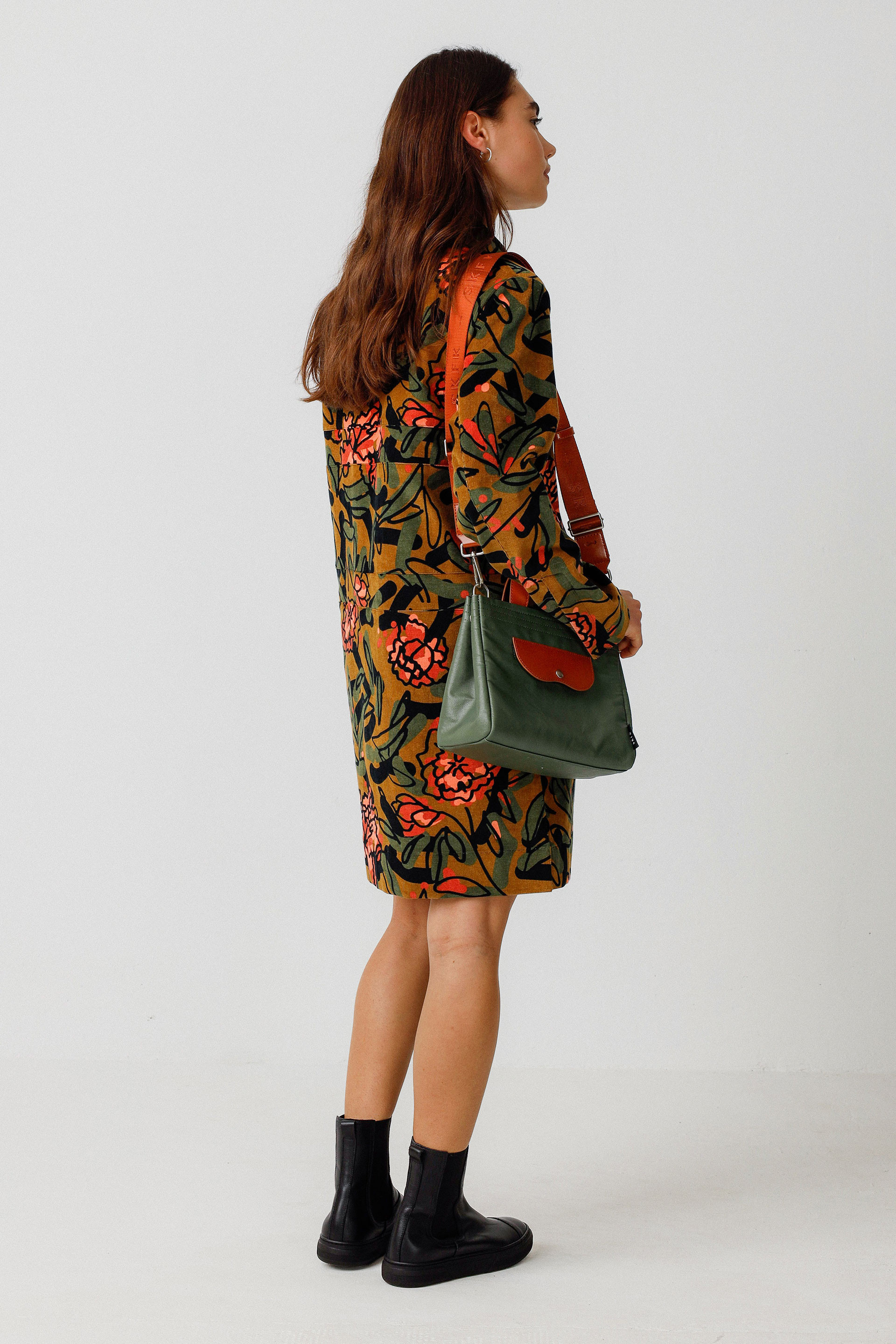 Larruzko eta kotoi birziklatuzko shopper poltsa. Poltsikoak aurrean eta atzean, uhal doigarri eta desmuntagarria, ixteko kremailera eta neurria doitzeko presio-botoiak. Beste poltsiko bat barruan eta forru estanpatua. Neurriak: 250 x 200 x 150 mm.