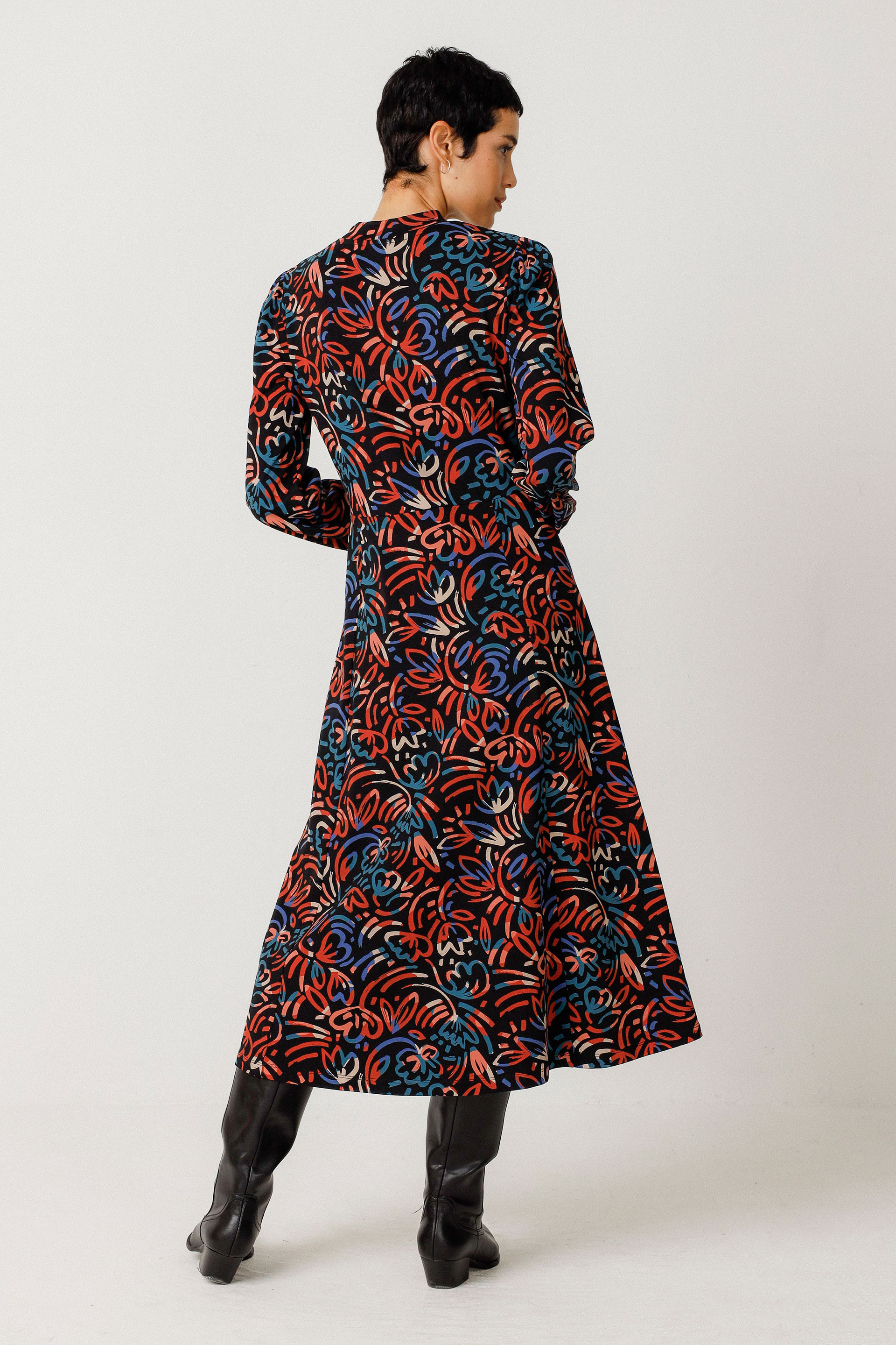 Kanpai-formako midi soinekoa. Mahuka luzea, eskumutur eta sorbalda izurtuak dituen mahuka luzea, gerri naturala eta lepo biribila. Janzteko erraza. Lore-estanpatu koloreanitza.