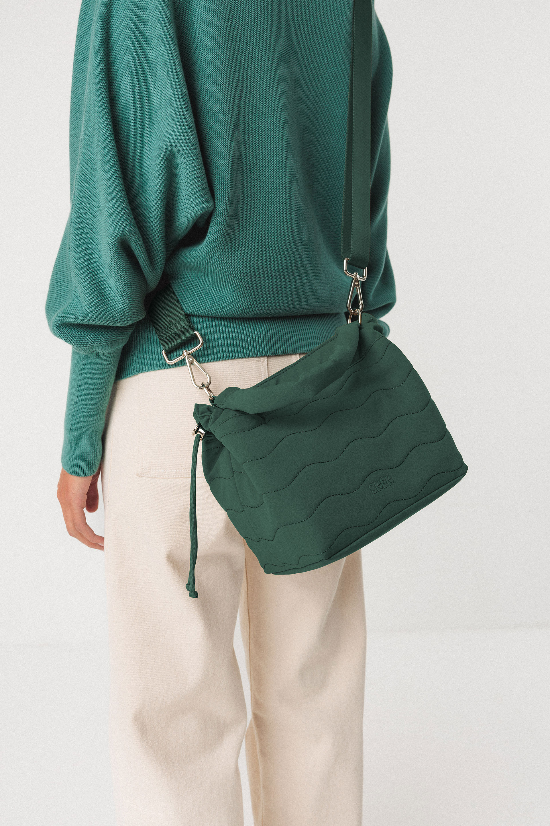 Poltsa karratua. Doitzeko lokarri elastikoak alboetan eta bi poltsiko. Gurutzatuta eramateko uhal doigarria eta eskuan eramateko heldulekua. Neurriak: 20 x 20 x 15 cm.