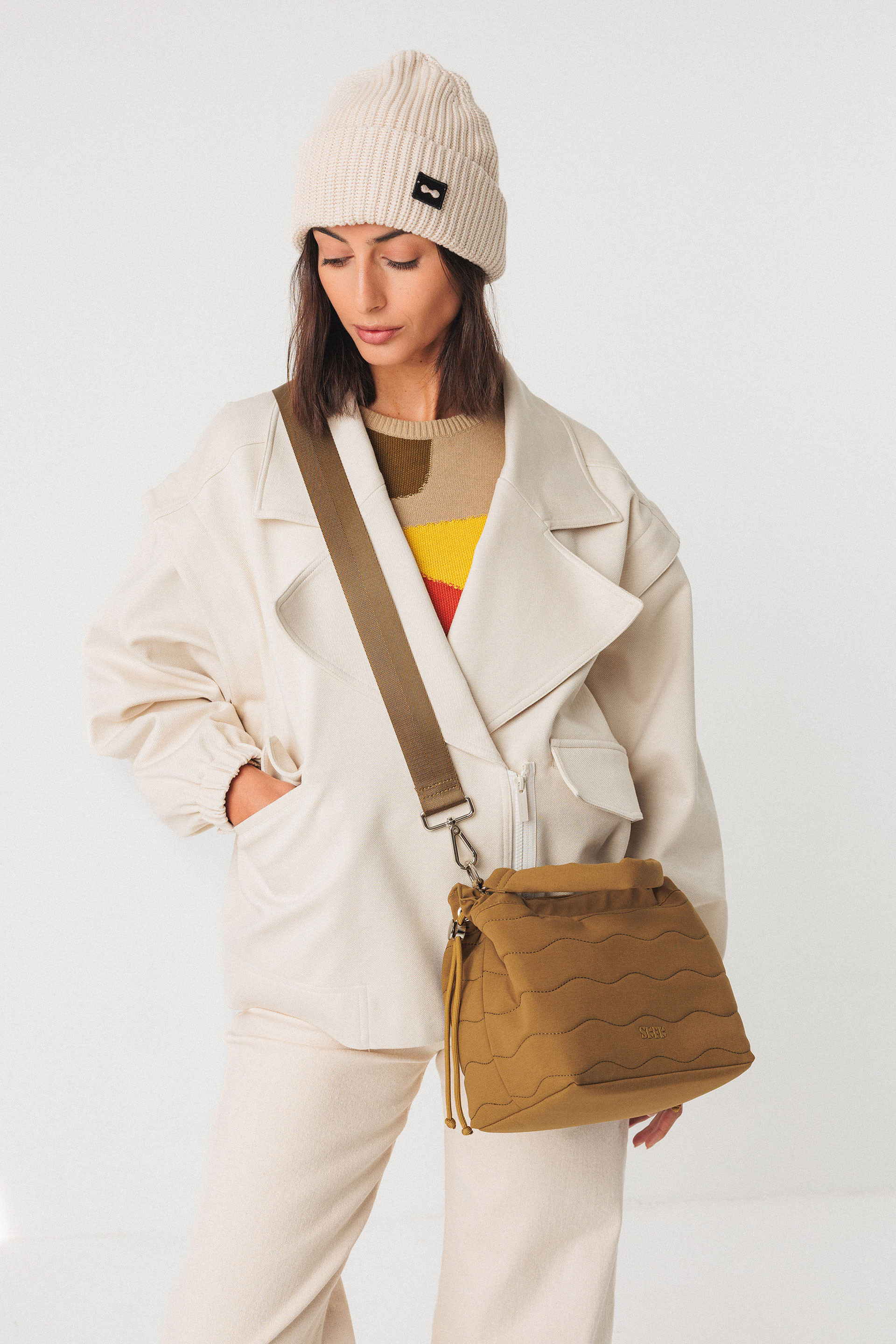 Poltsa karratua. Doitzeko lokarri elastikoak alboetan eta bi poltsiko. Gurutzatuta eramateko uhal doigarria eta eskuan eramateko heldulekua. Neurriak: 20 x 20 x 15 cm.