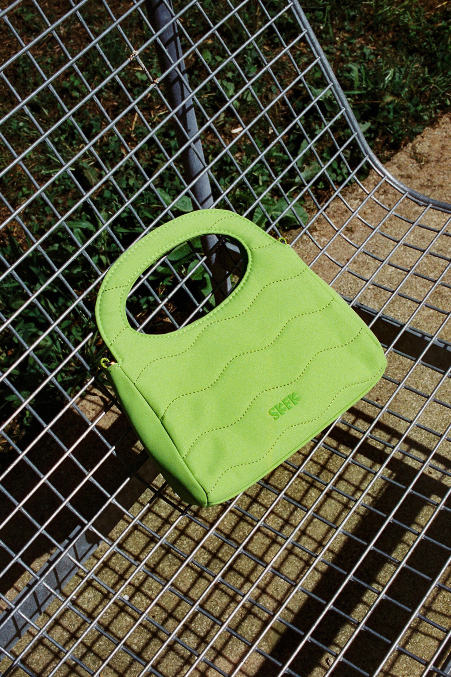 Poltsa karratu txikia. Gurutzatuta edo heldulekutik eramateko. Ixteko imana eta poltsiko bat barruan. Neurriak: 20 x 21 x 8 cm.