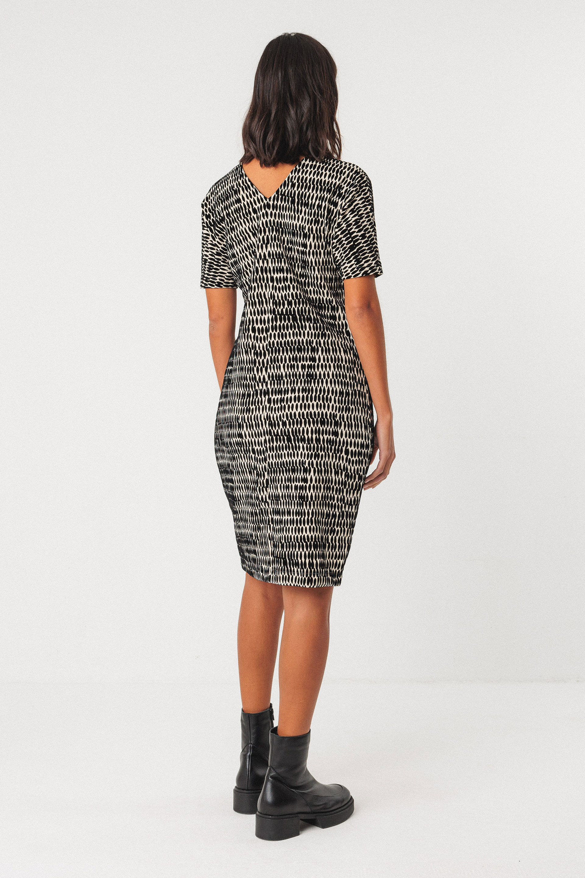 Belaunerainoko soineko estua, stretch kotoi organikozkoa. Lepo puntaduna, eskote puntaduna sorbaldan eta saguzar-mahuka motzak.