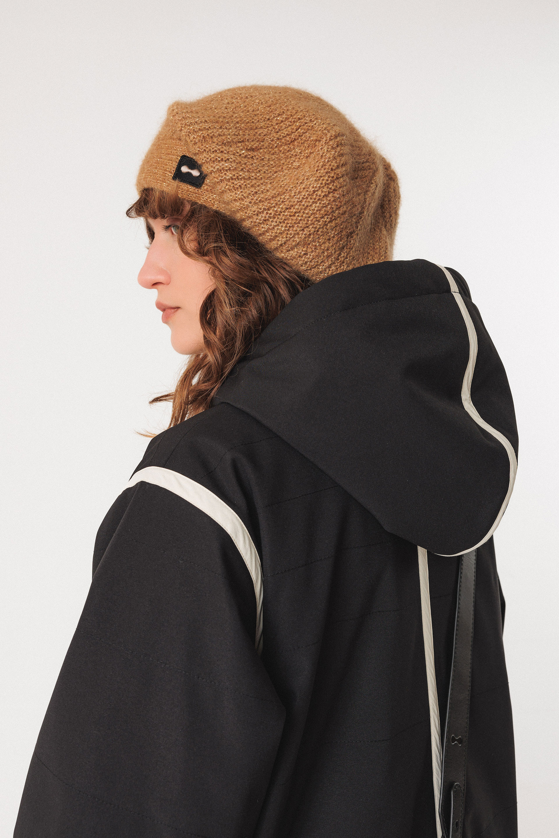 Puntuzko txanoa. Goi-mailako alpaka- eta poliamida-zuntz birziklatua. Petatxu apaingarria albo batean. Portugalen egina.