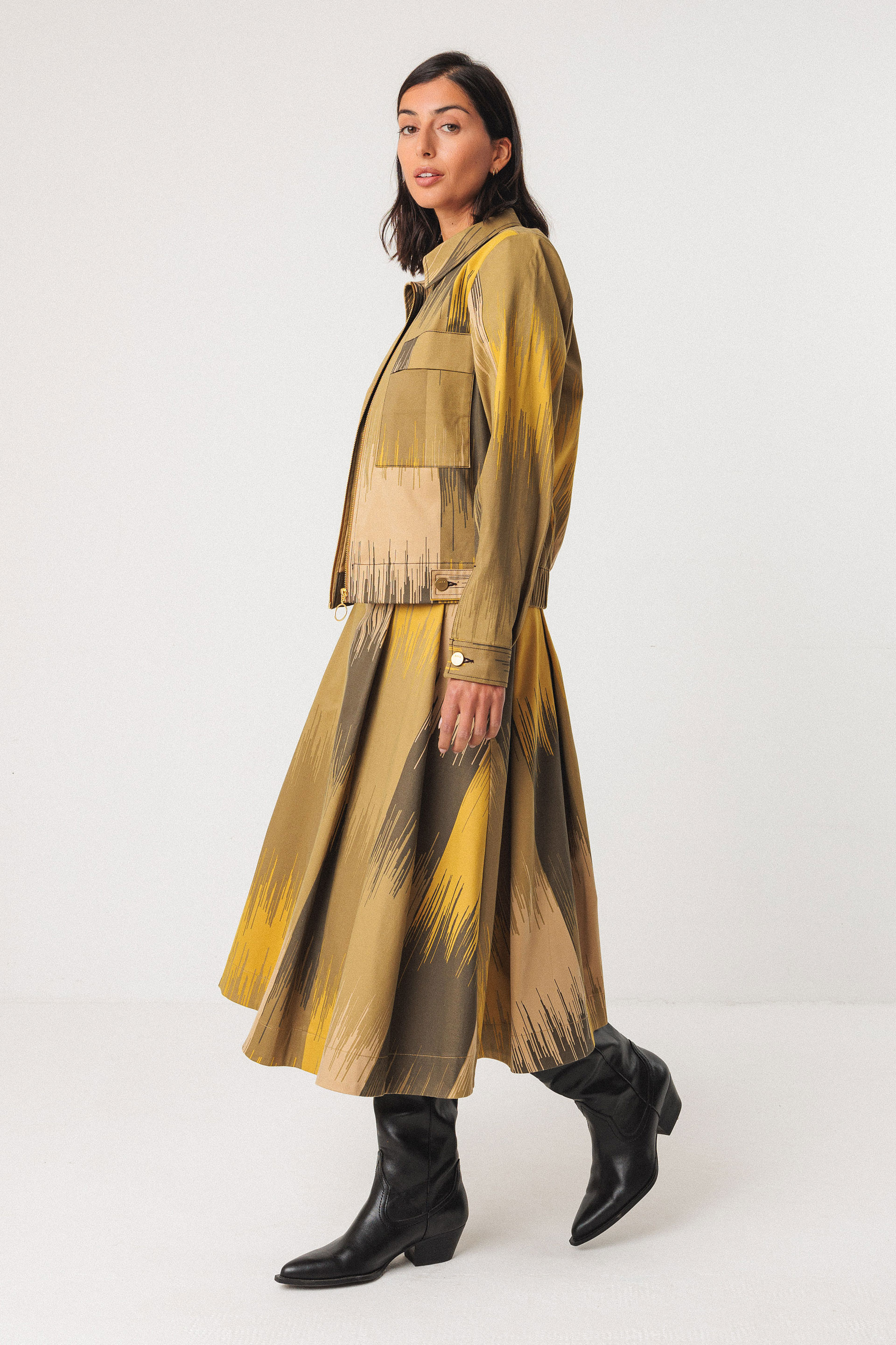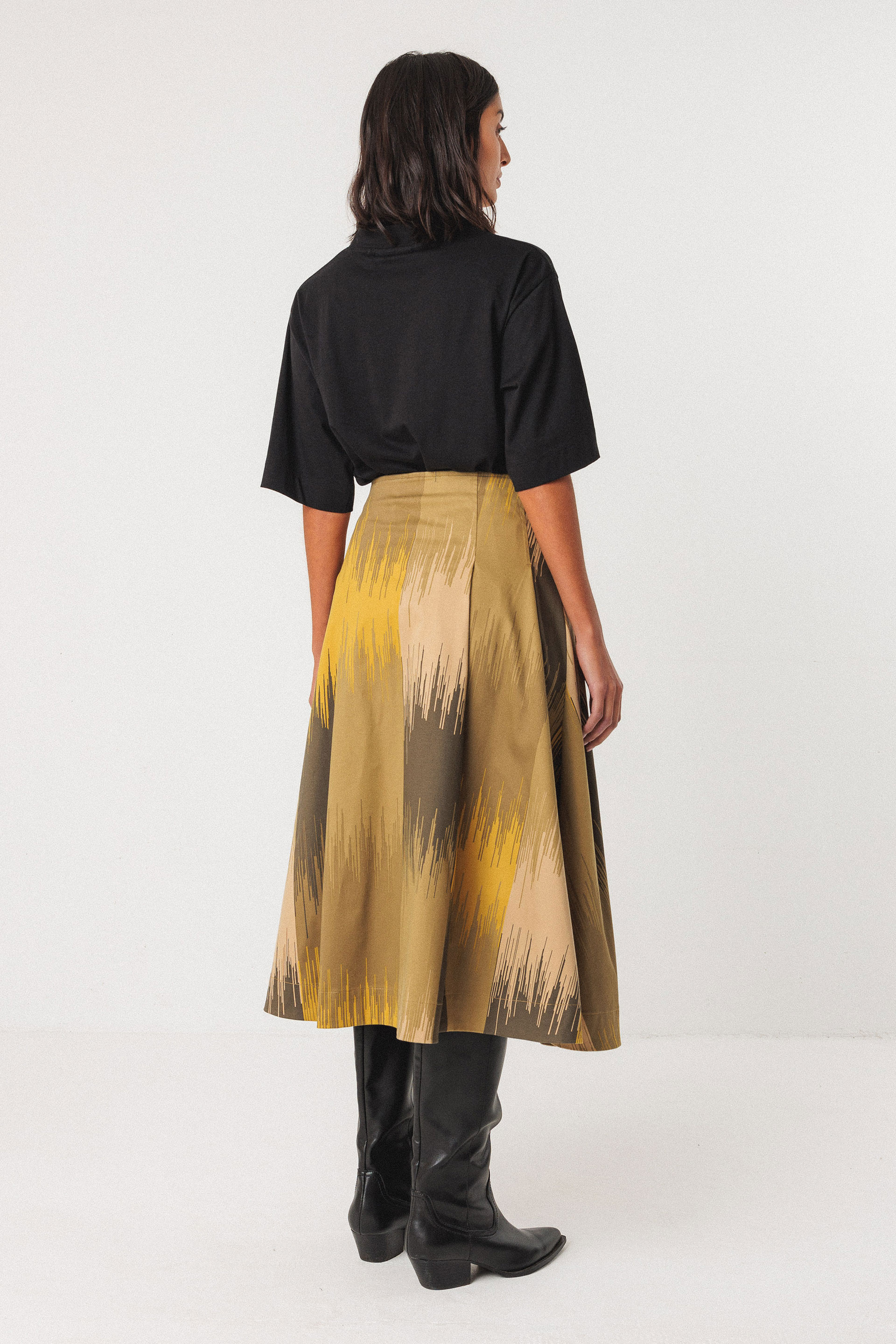 Belaun azpirainoko gona barren-zabala, kotoi organikozkoa (GOTS ziurtagiria). Poltsikoak alboetan eta ixteko kremailera albo batean. Tamaina handia bada, tamaina bat txikiagoa aukeratzea gomendatzen da.
