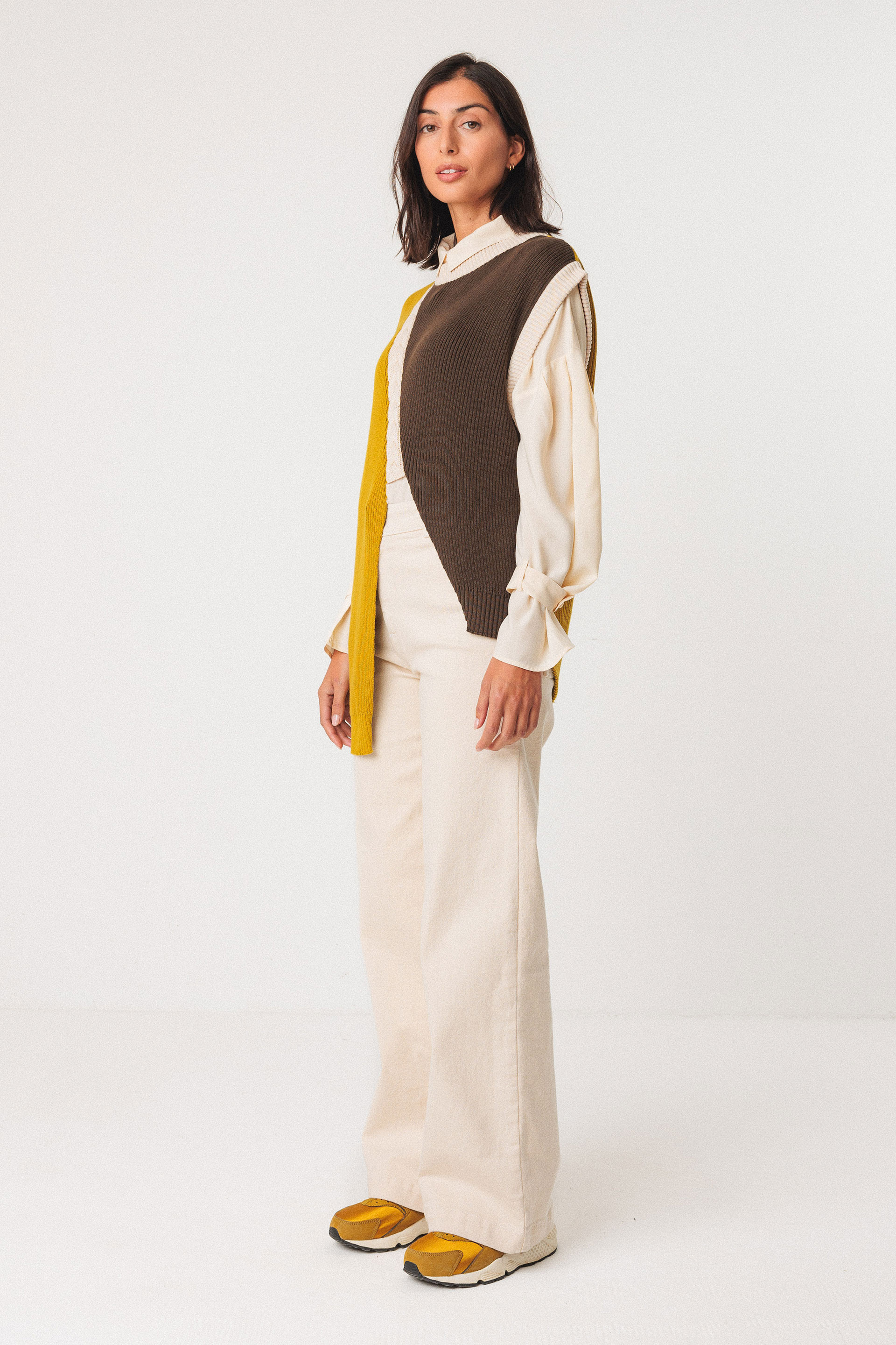 Jertsea, puntu ez oso lodizkoa. Luzea eta mahukagabea. Lepo luzea eta hozka eroriak. Gerri asimetrikoa eta kontraste egiten duten kolore desberdinetako zatiak.