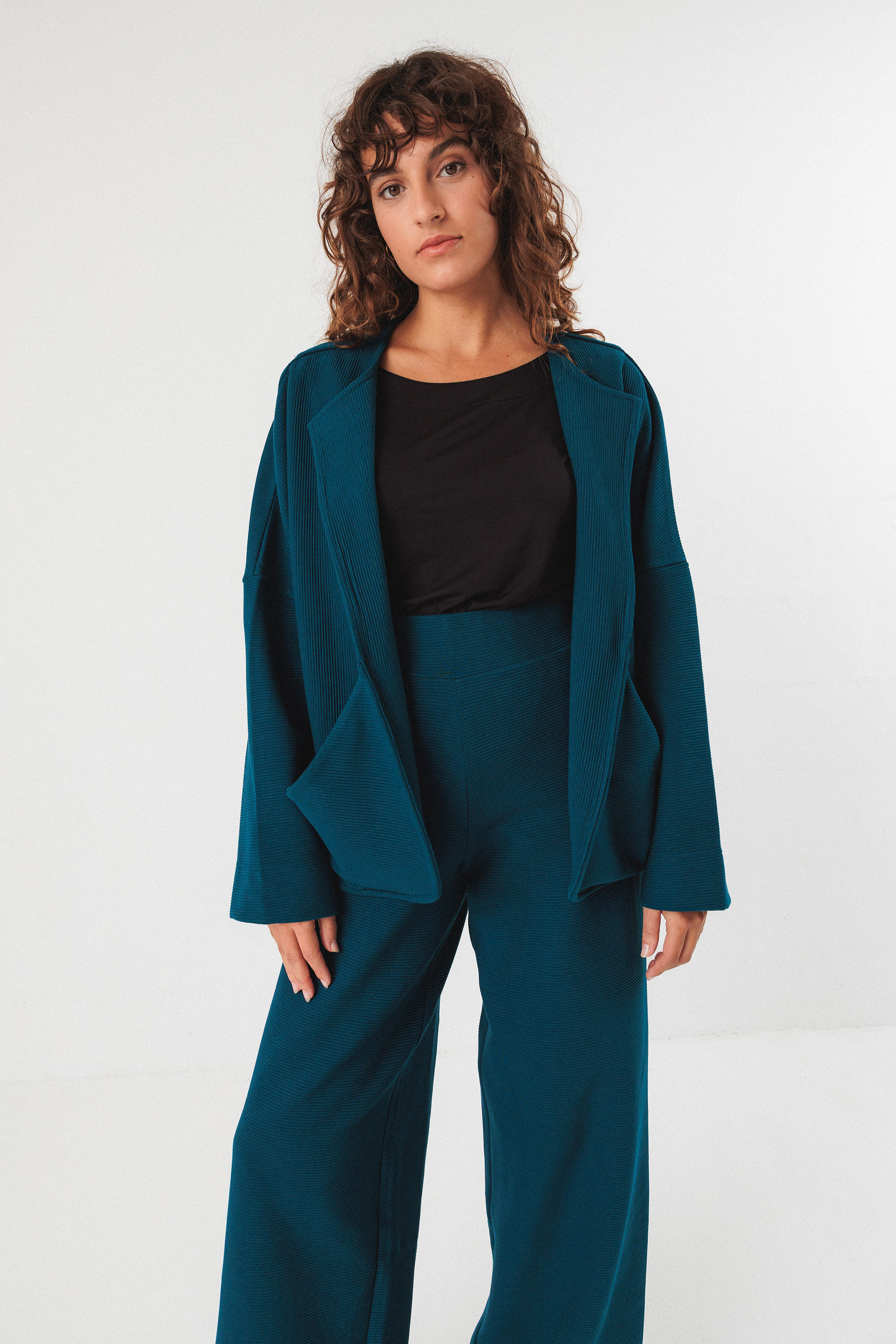 Cardigan jaka zabala, kotoi organikozkoa (GOTS ziurtagiria). Kimono-mahukak eta poltsikoak aurrean.