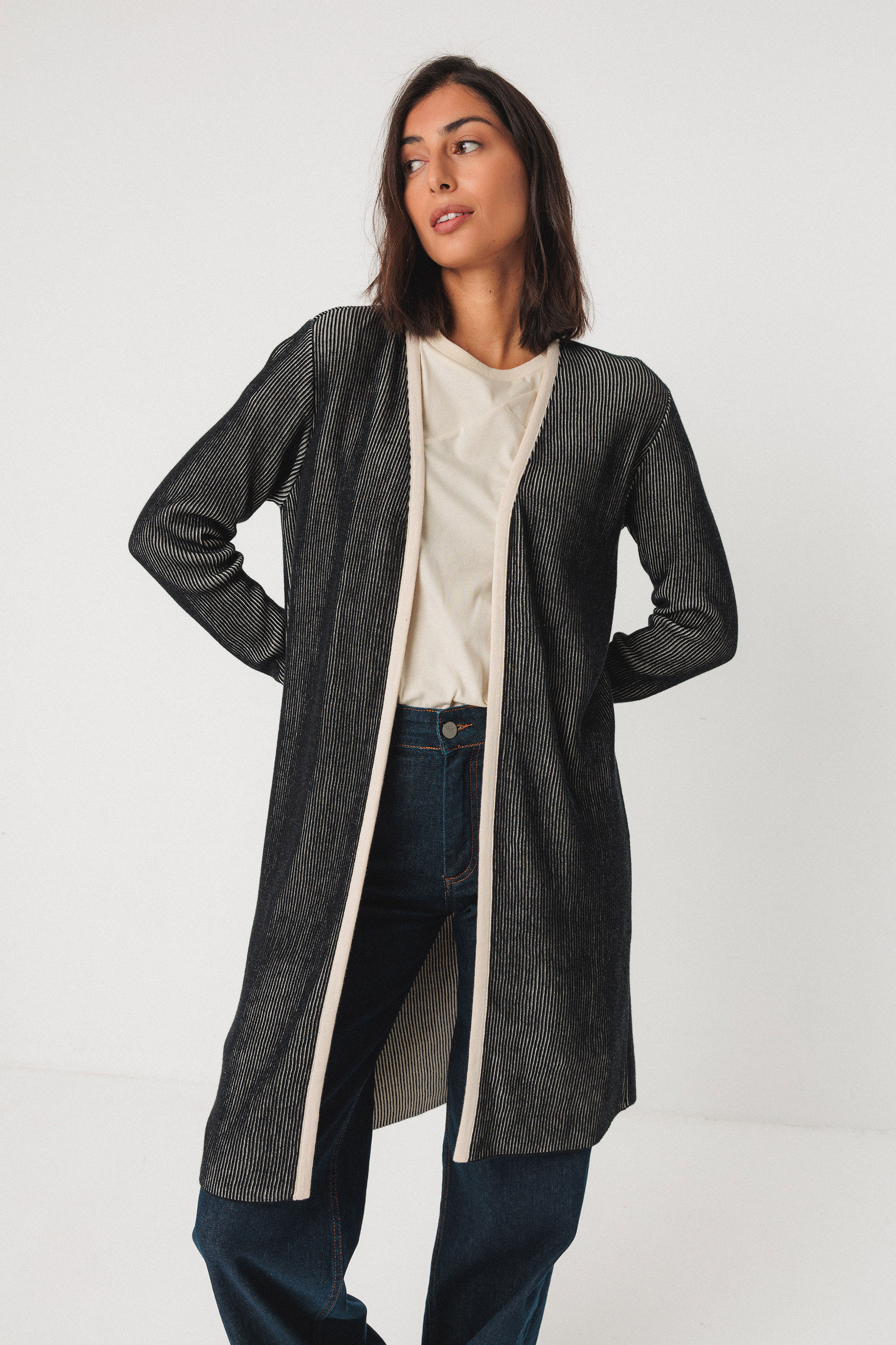 Cardigan jaka, kotoi organikozkoa (GOTS ziurtagiria). Luzea eta irekia. Bi koloreko kanale puntu ez oso lodia.