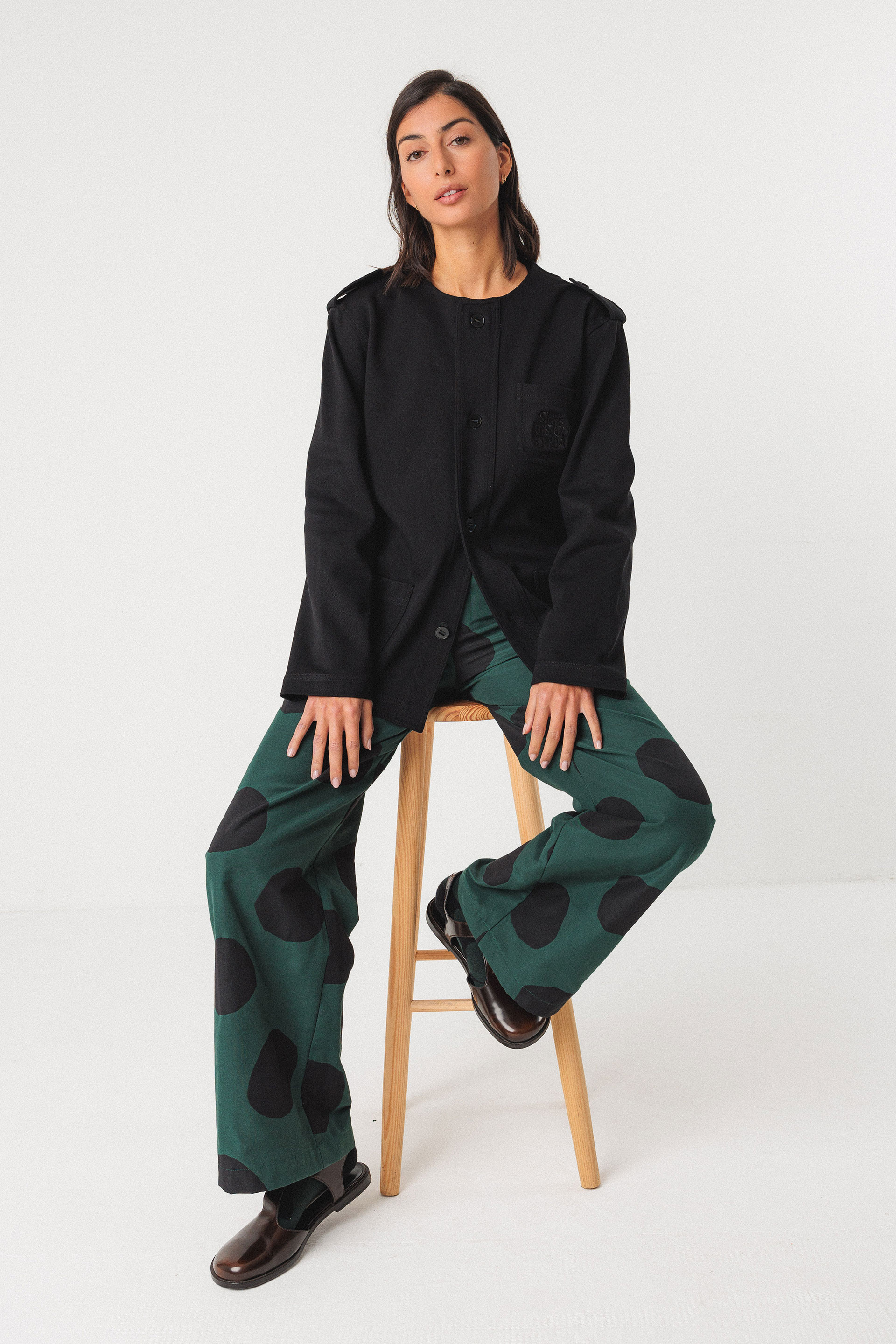 Galtza zuzenak, jacquard marrazkidun ehunezkoak. Kremaileradun brageta aurrean, poltsikoak zeharka eta azpildutako poltsiko faltsuak atzean.