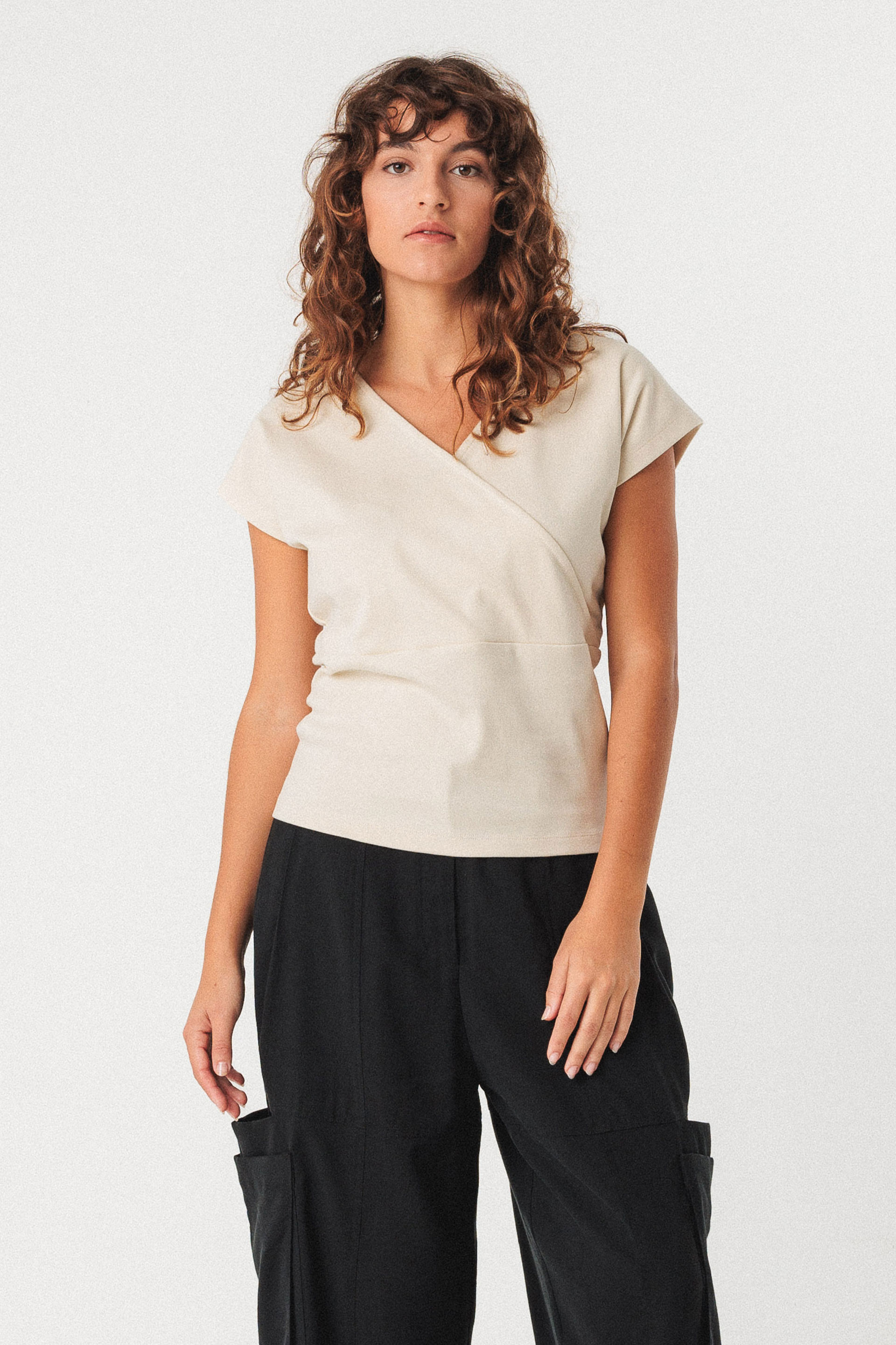 Kamiseta estu eta mahukagabea. Lepo puntaduna.