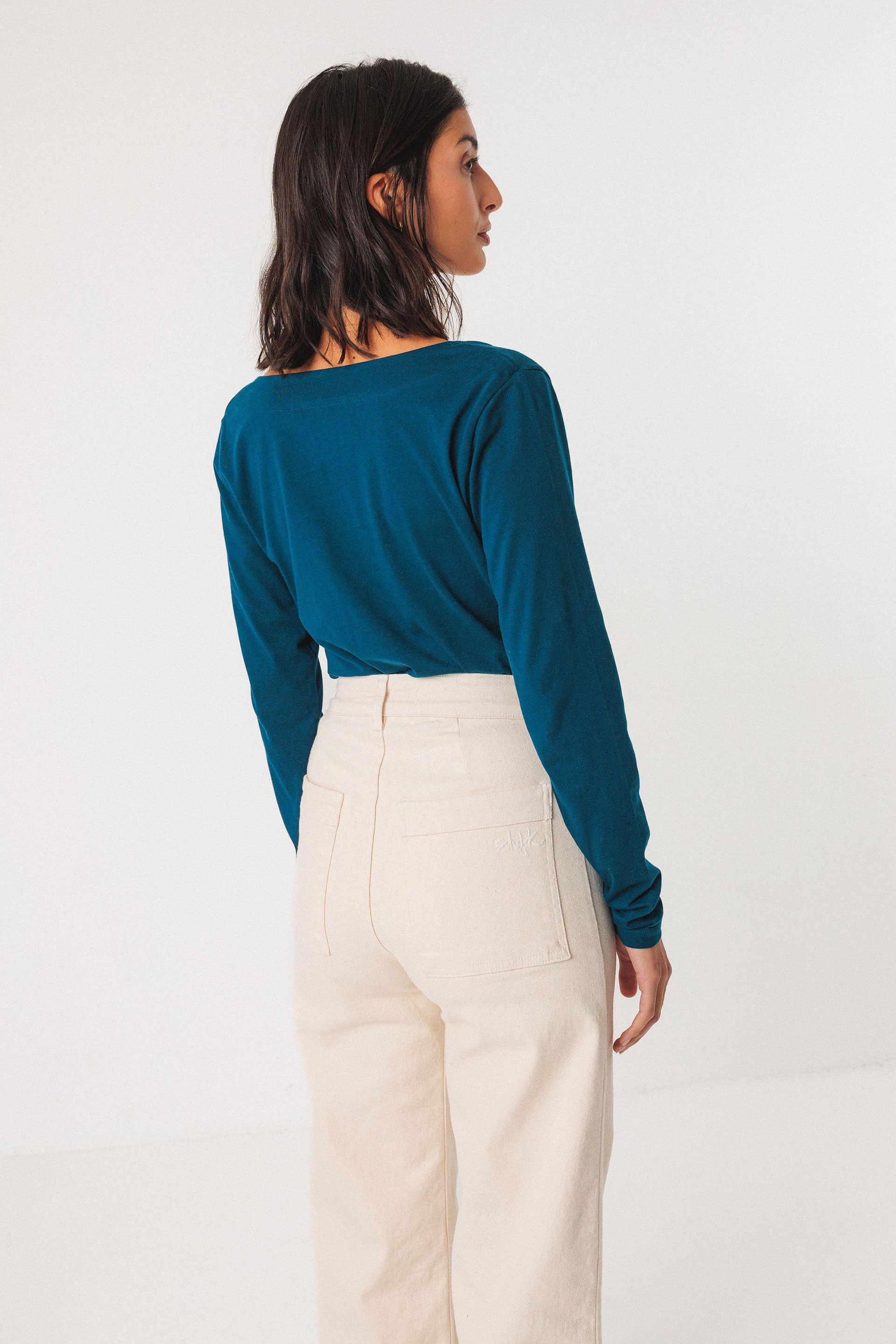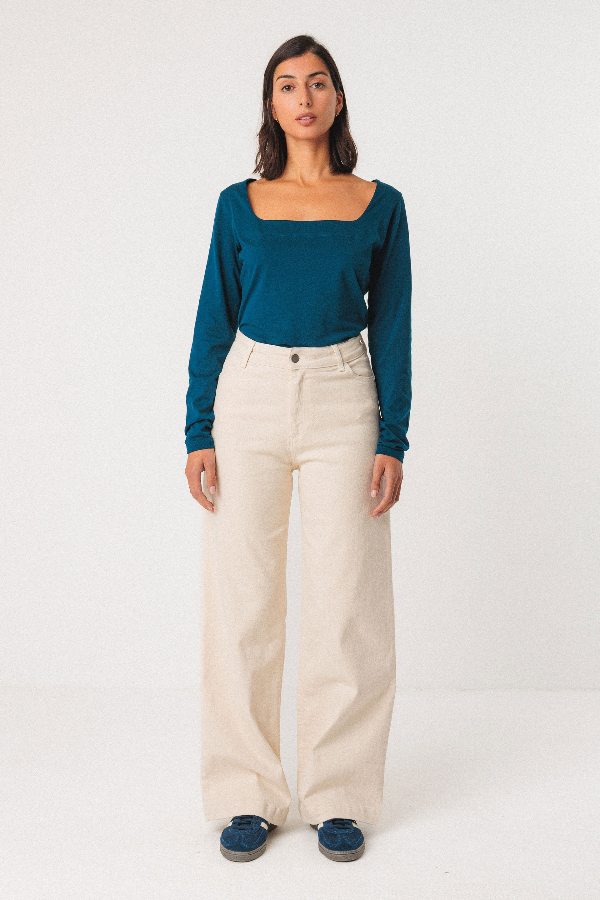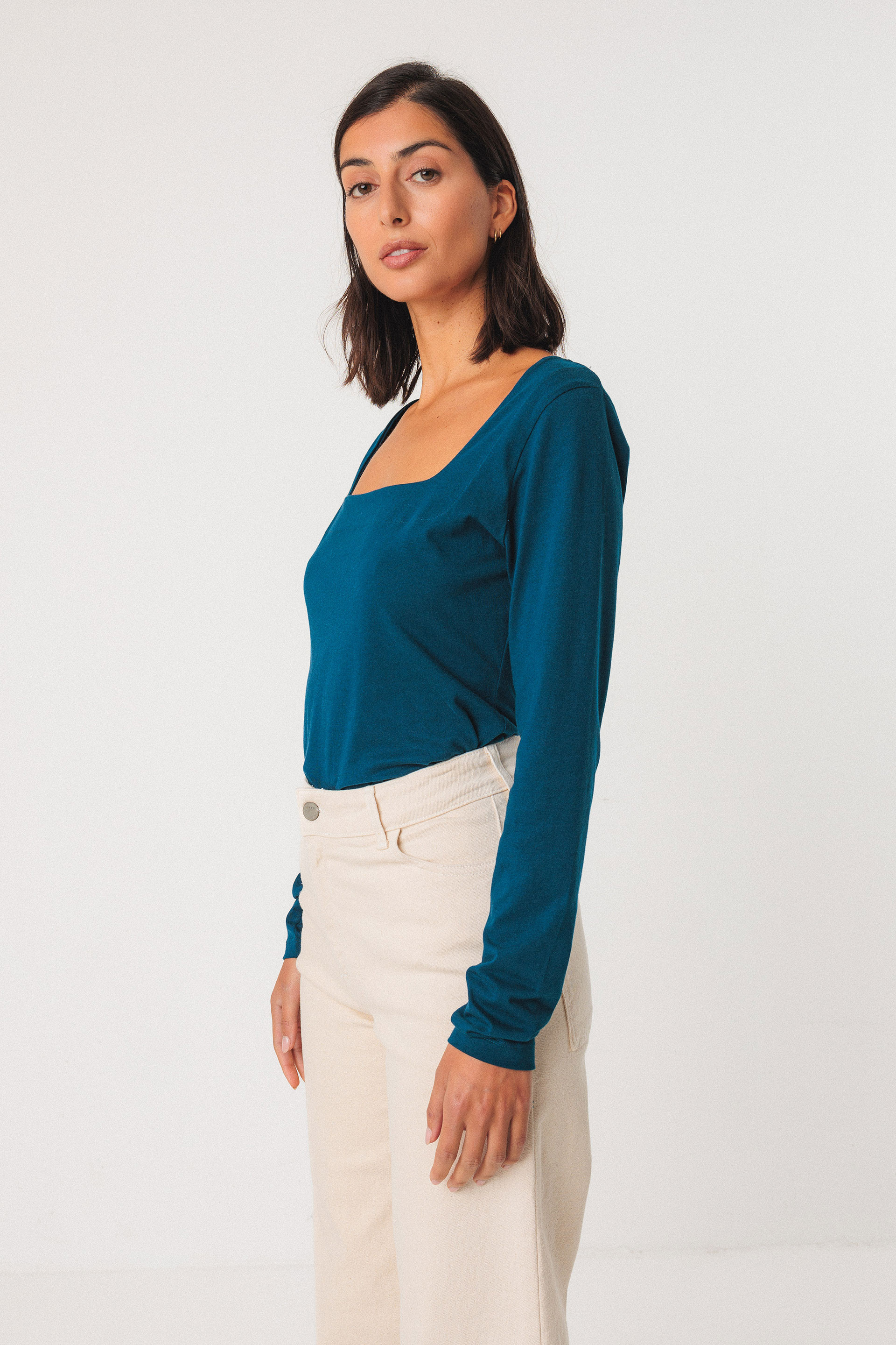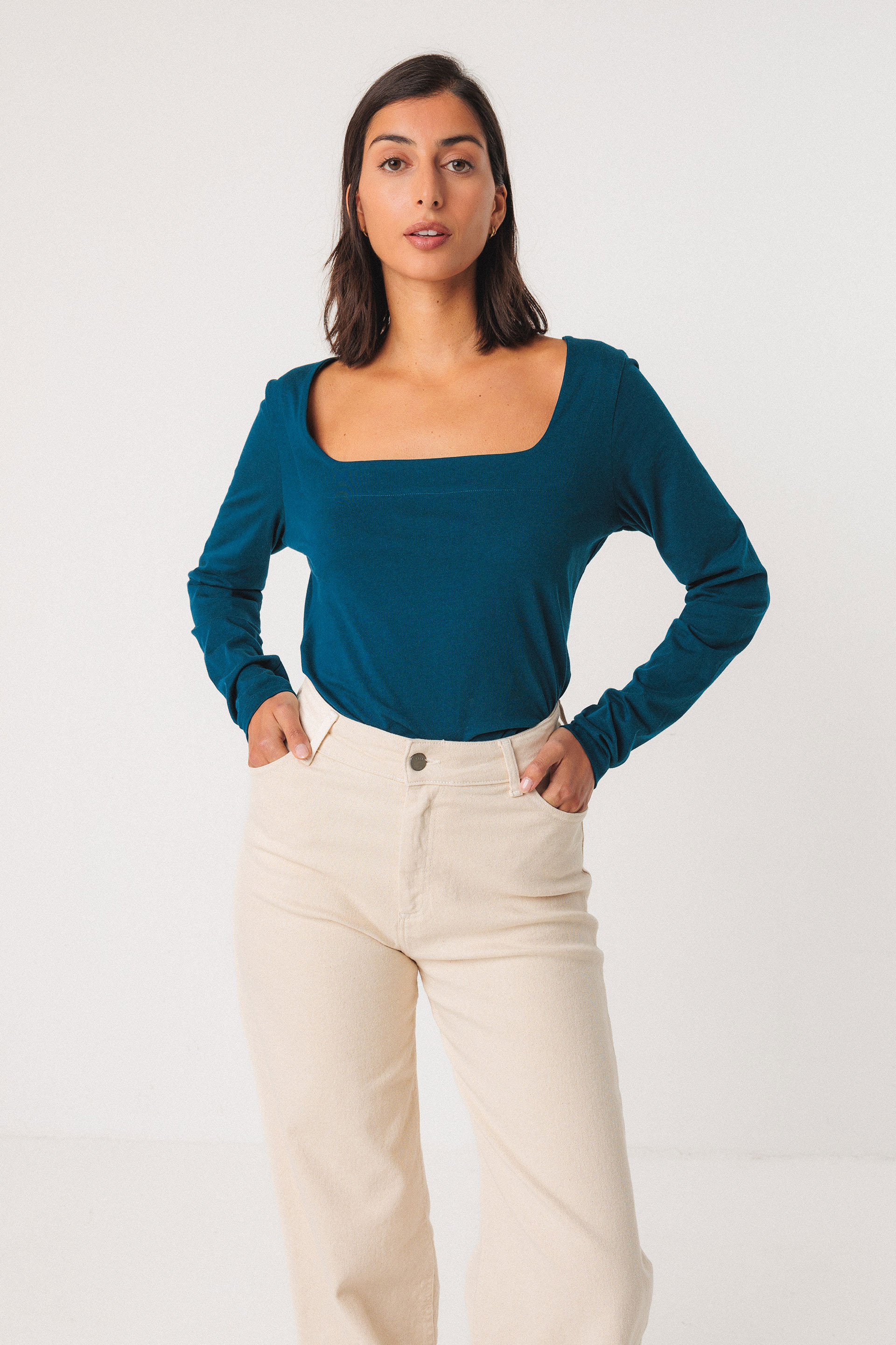 Kamiseta estua. Mahuka luzea eta eskote karratua.