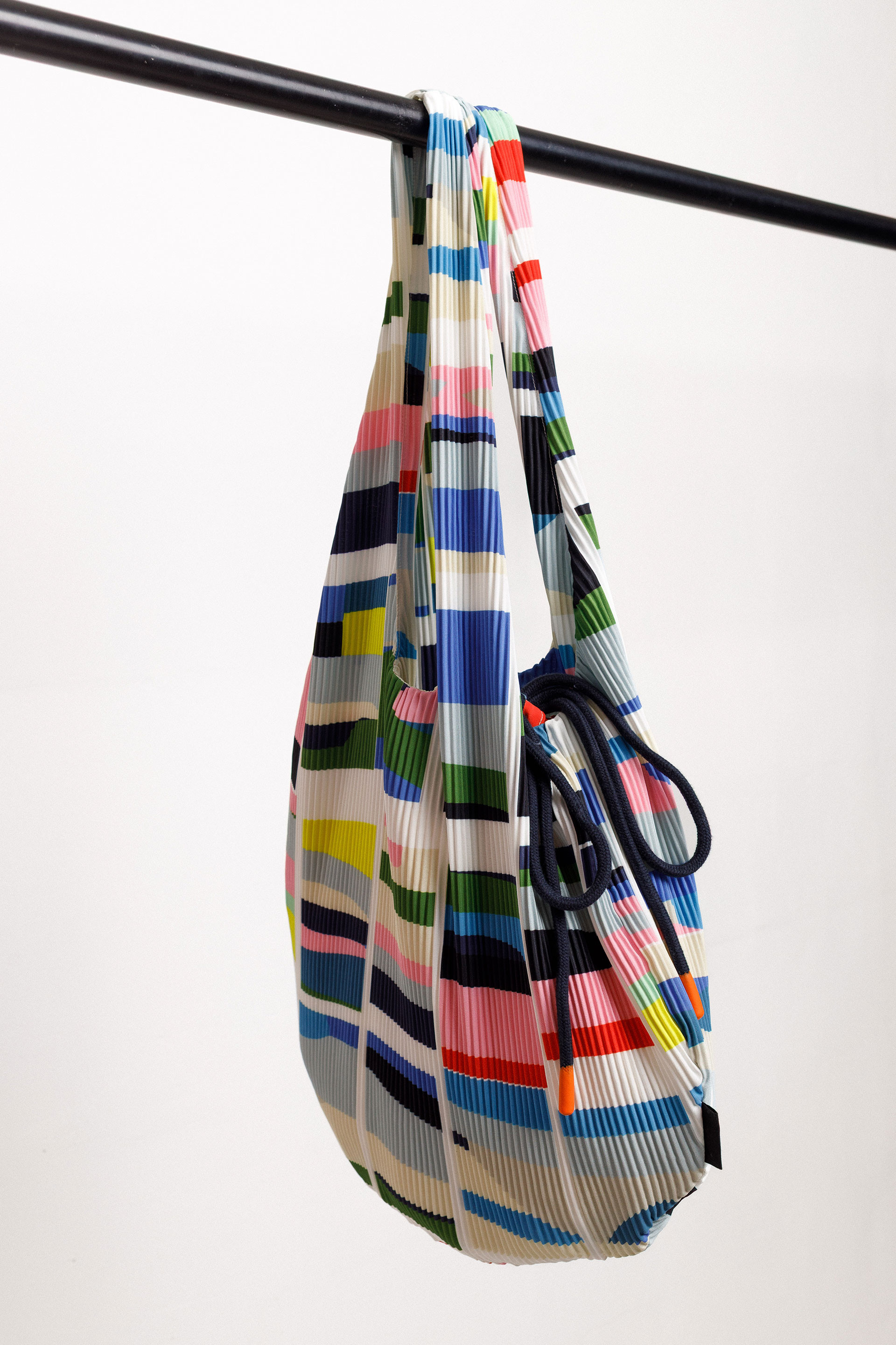 Tote bag en tissu plissé imprimé, avec une fermeture ajustable par cordon de serrage et deux anses. Collaboration avec l’artiste Grems. Dimensions 40 x 66 cm.