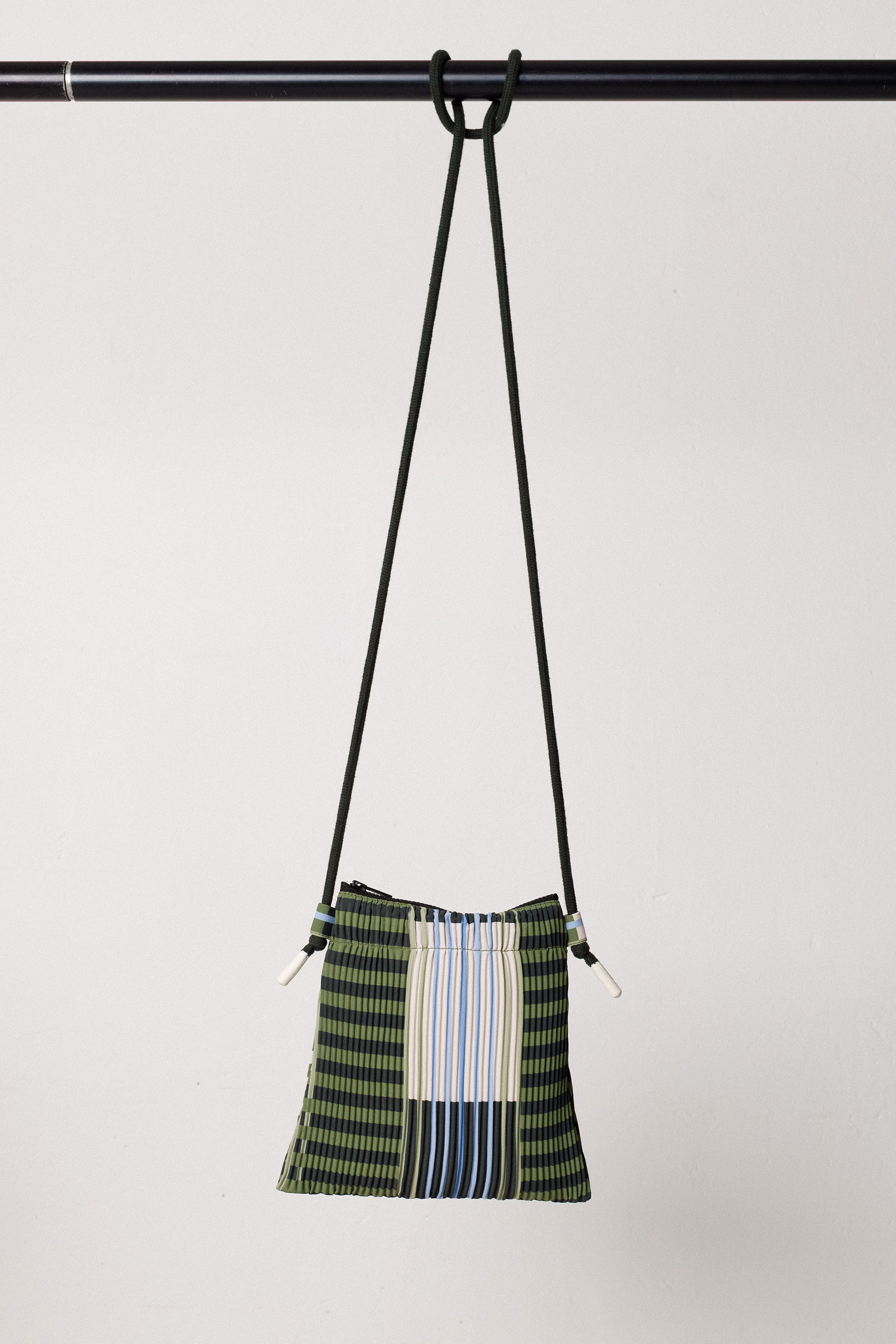 Petit sac à porter en bandoulière, avec une fermeture zippée et une matière en tissu plissé imprimé. Dimensions 20 x 20 cm.