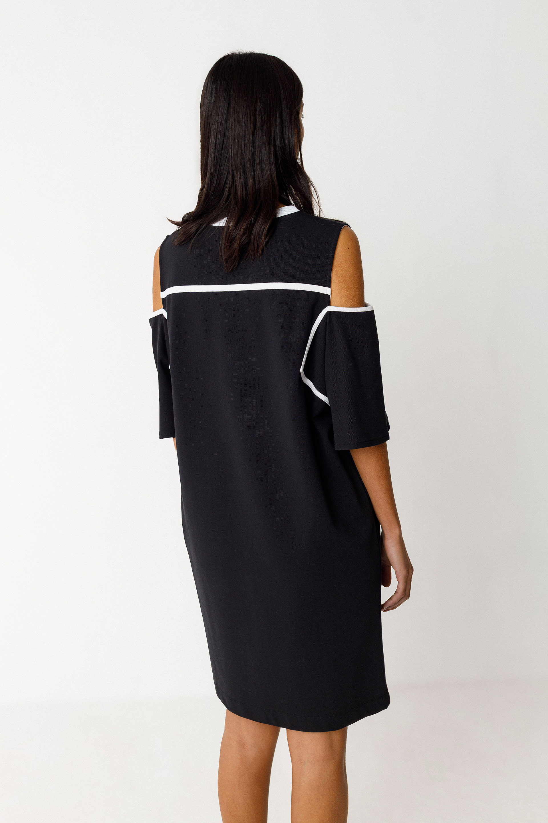 Robe courte et ample à manches courtes et encolure arrondie. Elle se distingue par ses découpes aux manches relevées de passepoils contrastants.