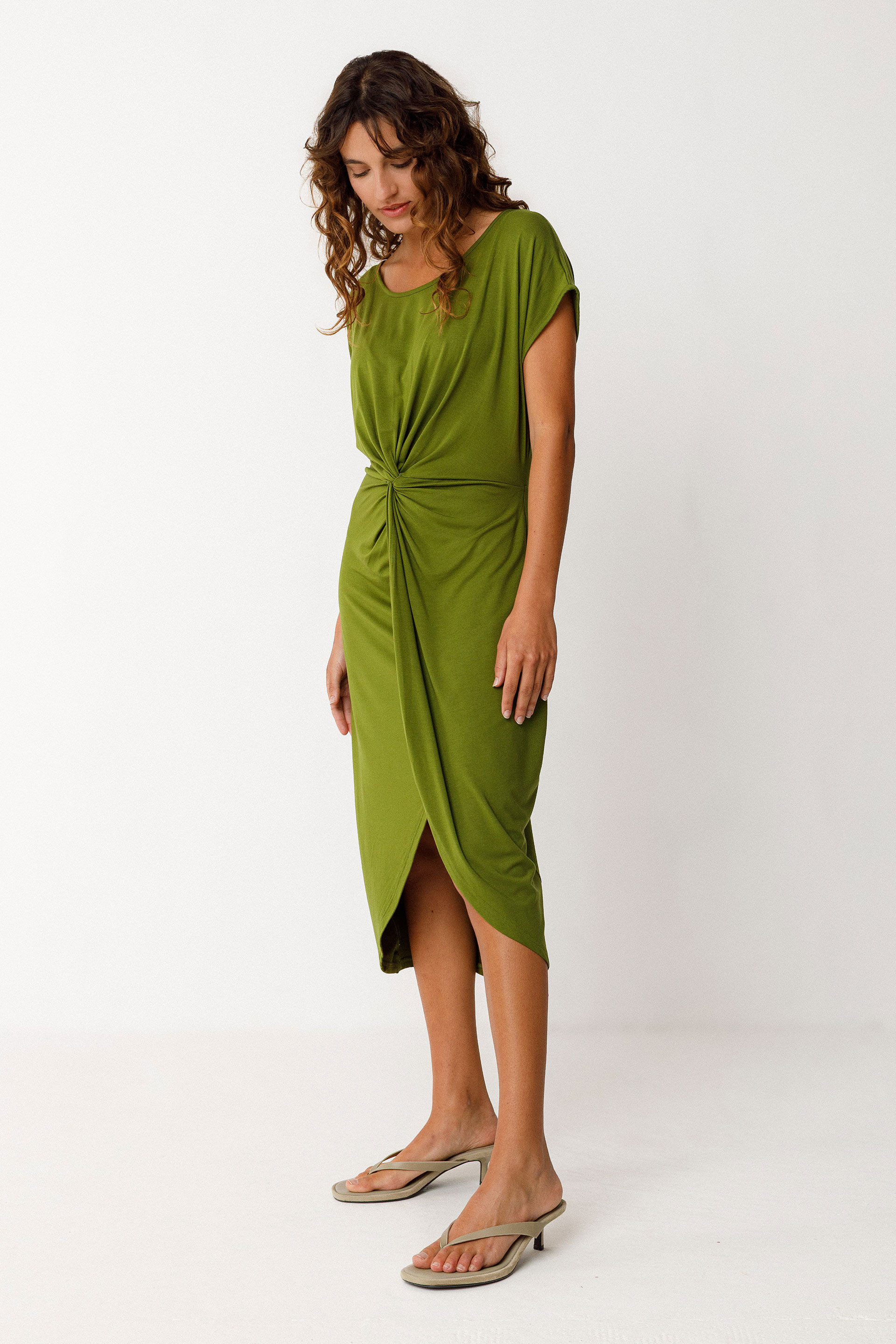 Robe sous le genou avec effet noué devant. Elle affiche un col bateau, des épaules tombantes et une taille élastiquée au dos.