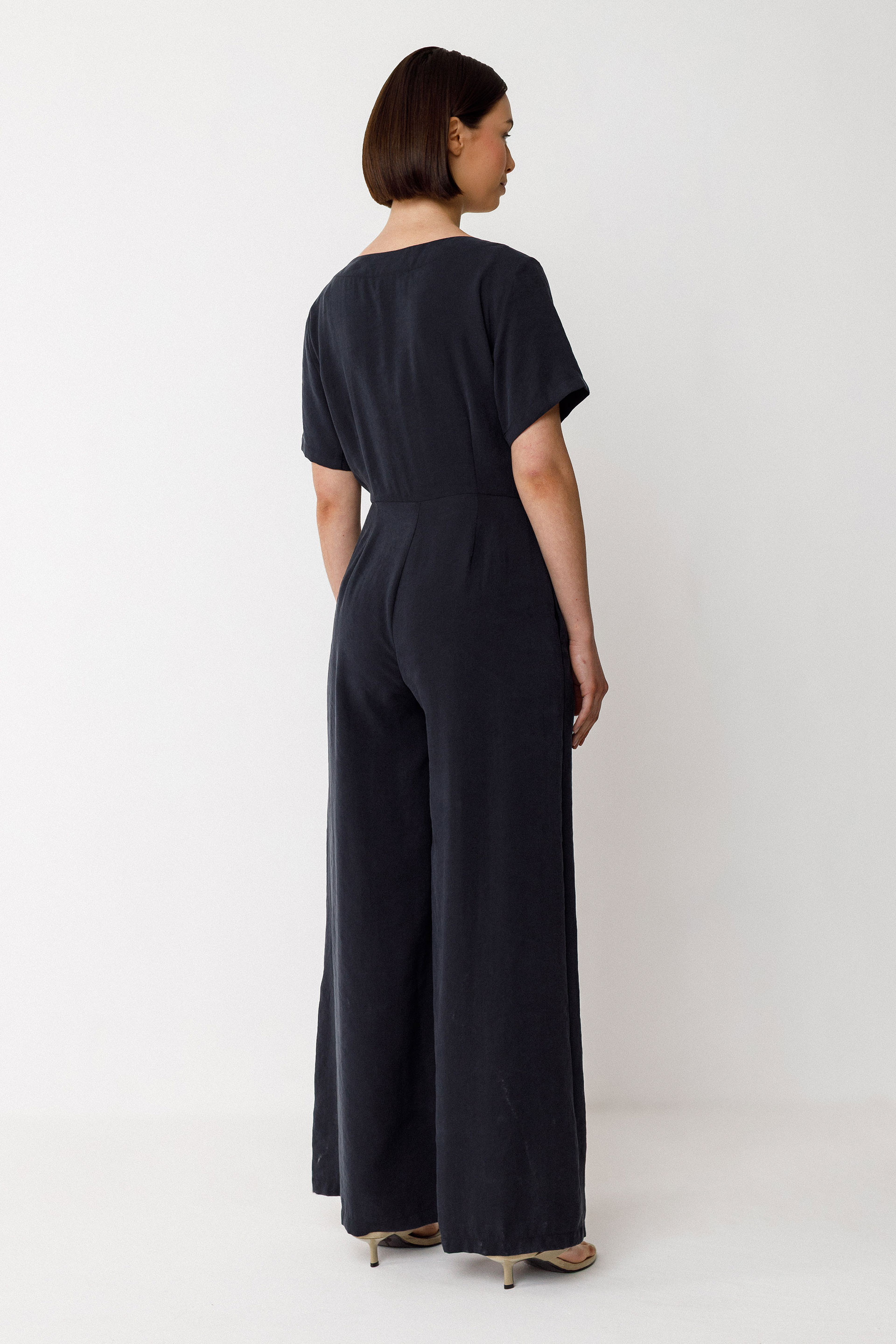 Combinaison jupe-pantalon palazzo. Dotée d’un col V et de poches sur les côtés, elle présente une fermeture boutonnée devant. Longueur totale pour une talle 38 : 148 cm.