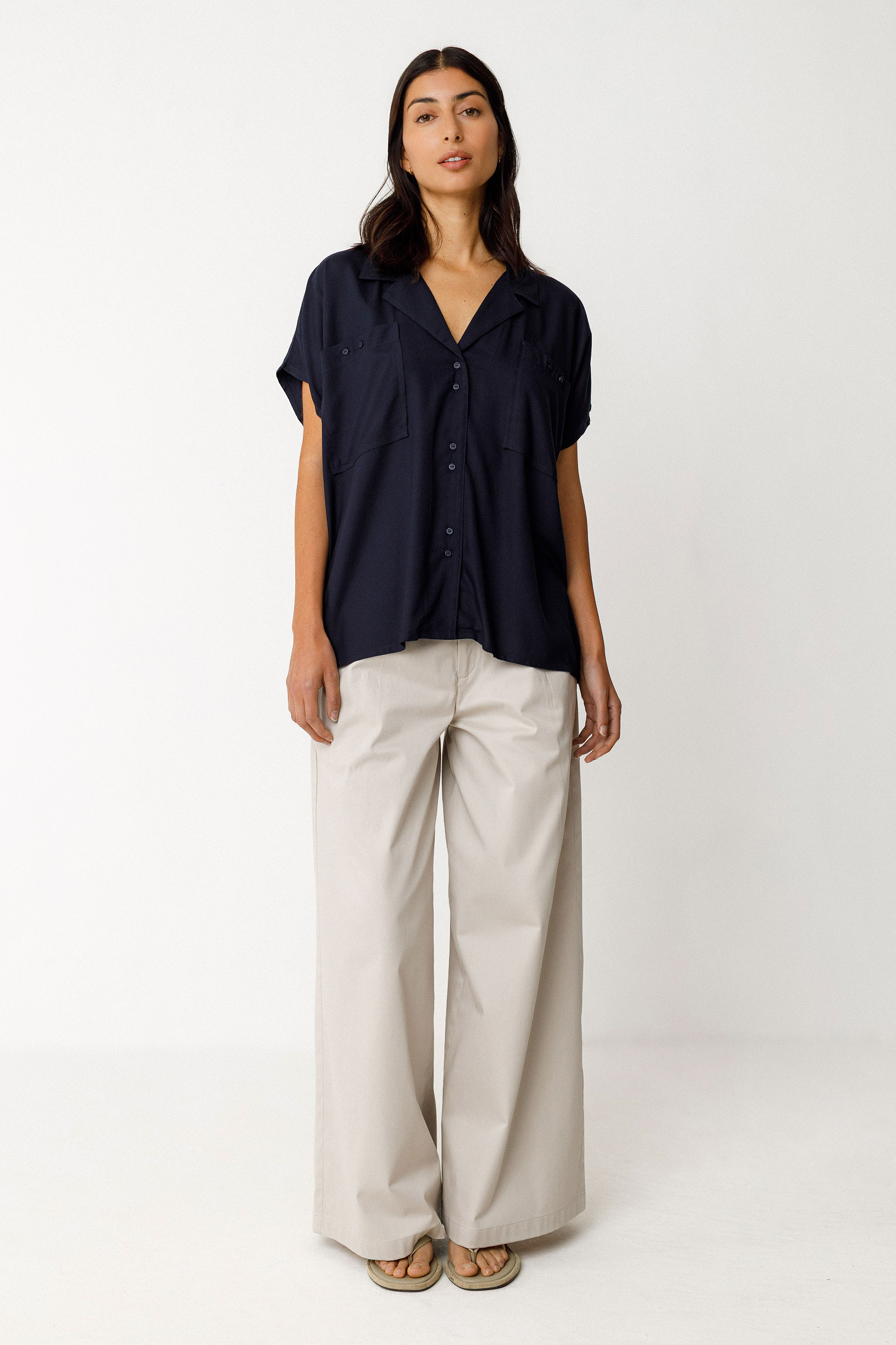 Chemise sans manches à coupe carrée avec une longueur aux hanches, un col ouvert plongeant, une fermeture boutonnée devant et des poches sur la poitrine.