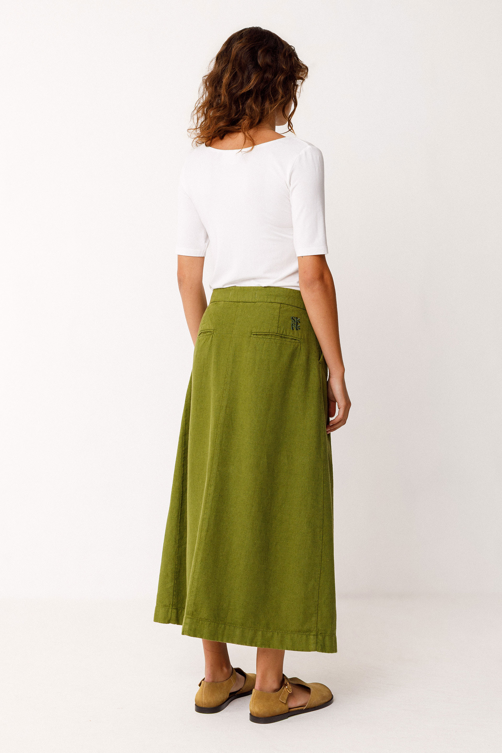 Jupe midi de forme évasée avec une braguette zippée devant. Elle présente des poches sur les côtés et une fente au centre sur l’avant.