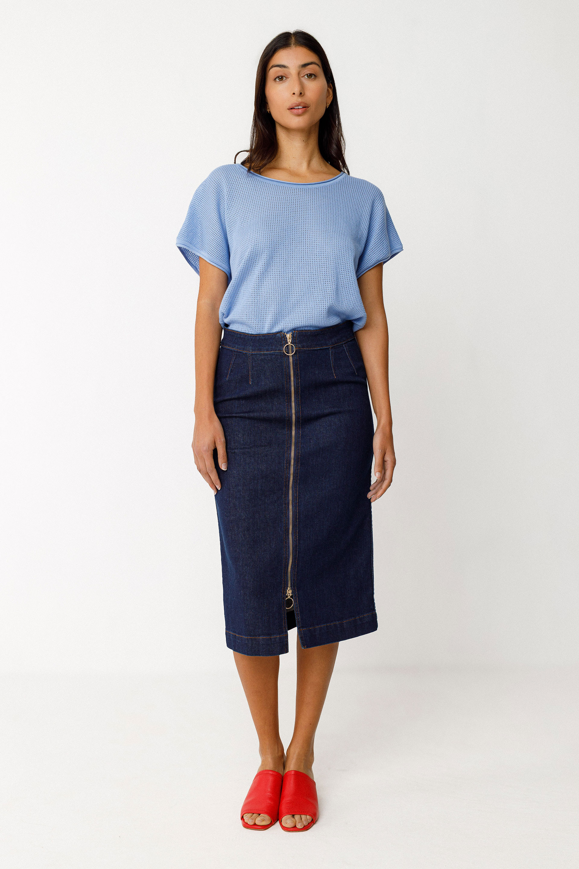 Jupe crayon longueur midi, avec une fermeture zippée devant et des poches plaquées au dos