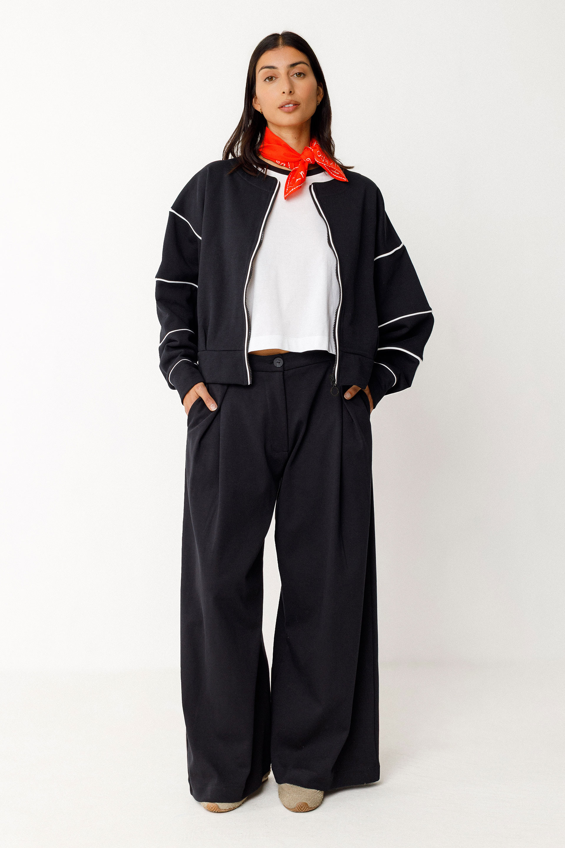Pull oversize en coton biologique certifié GOTS. Doté d’une encolure arrondie et d’une fermeture zippée centrale sur l’avant, il est relevé de détails en passepoil contrastant.