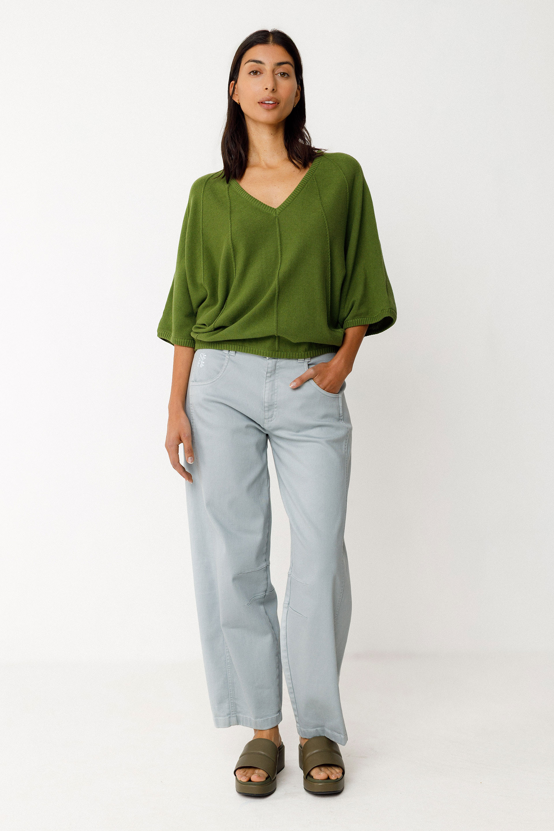 Pull à col V et manches courtes coupe chauve-souris, confectionné en maille légère de coton biologique certifié GOTS. Bordure côtelée en bas de manche et à la taille.