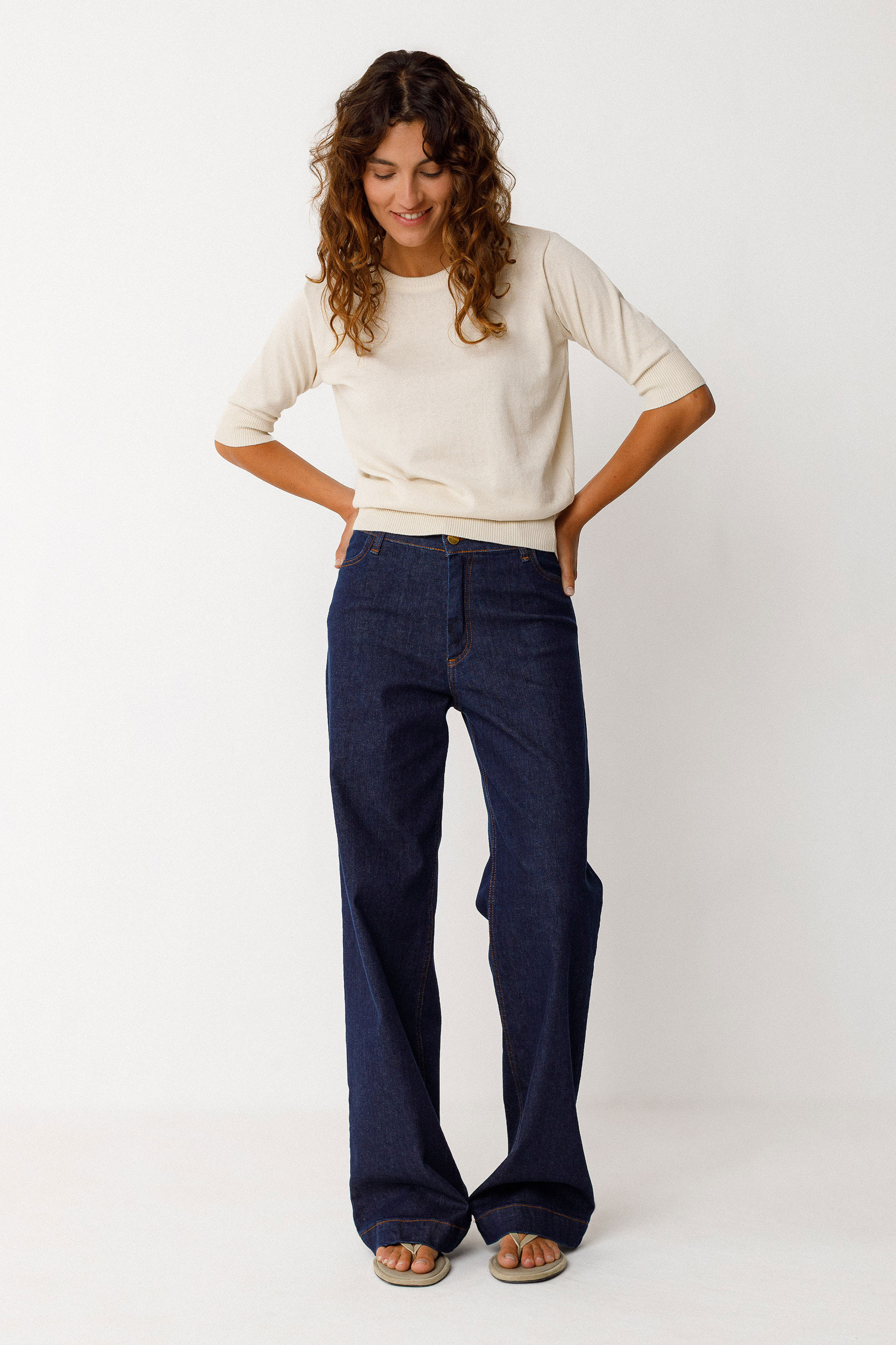 Pull bicolore à effet de texture, confectionné en maille légère de coton biologique certifié GOTS. Il affiche un col rond, des manches 3/4 et des finitions côtelées au col, en bas de manche et à la taille.