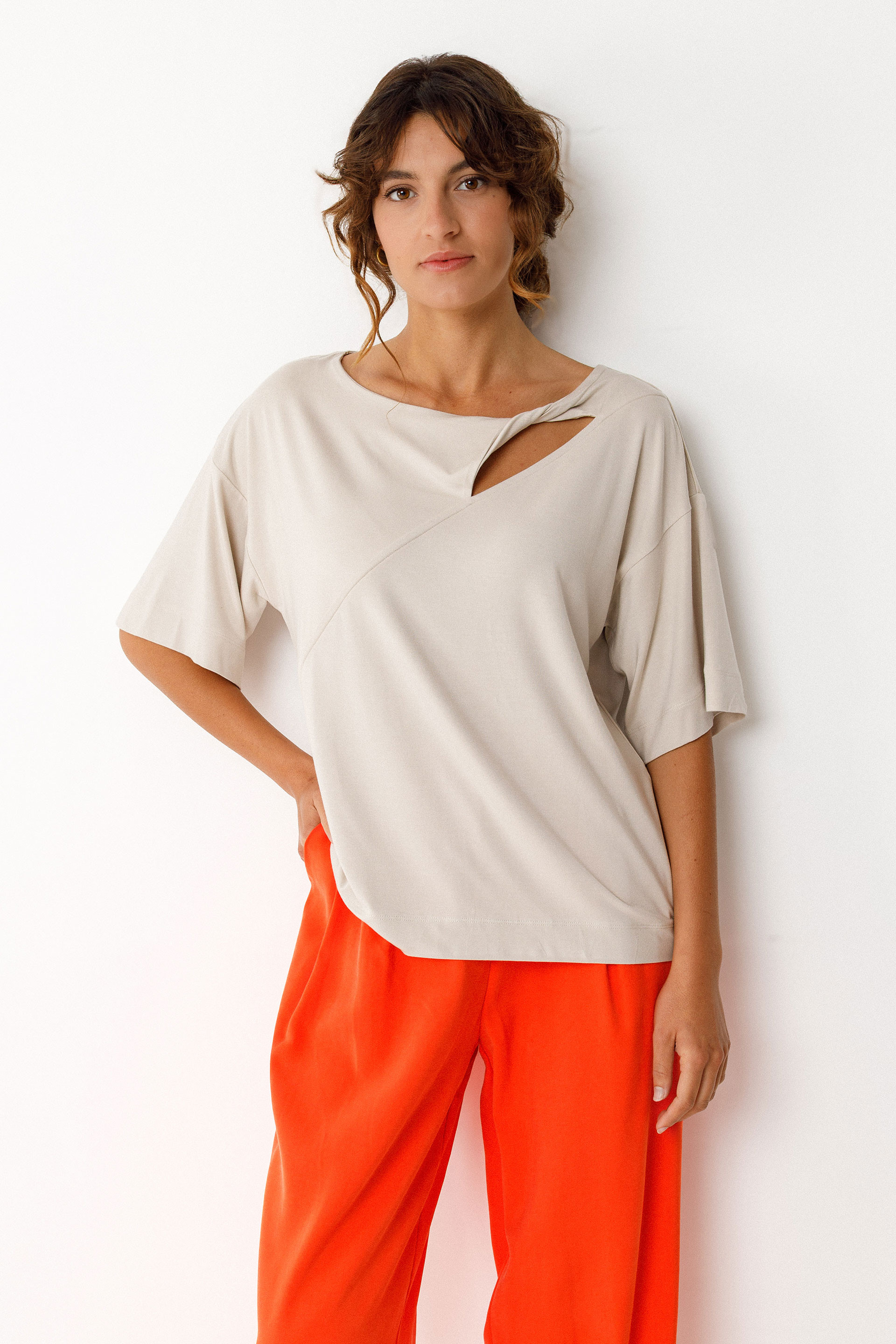 T-shirt à coupe ample, col bateau et manches courtes, avec un effet noué devant.