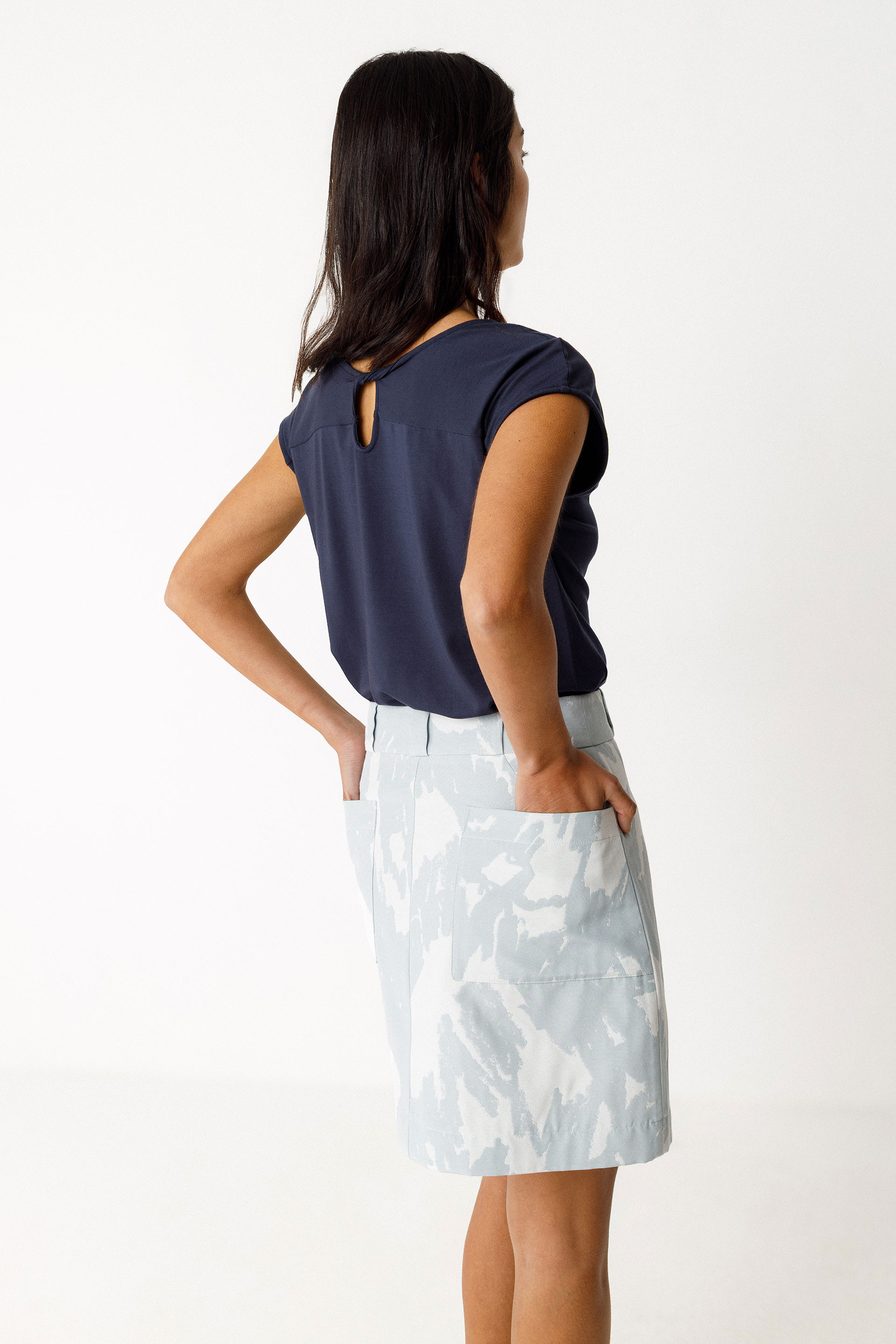 T-shirt à col rond et manches courtes avec une découpe décorative dans le dos. Coupe droite.