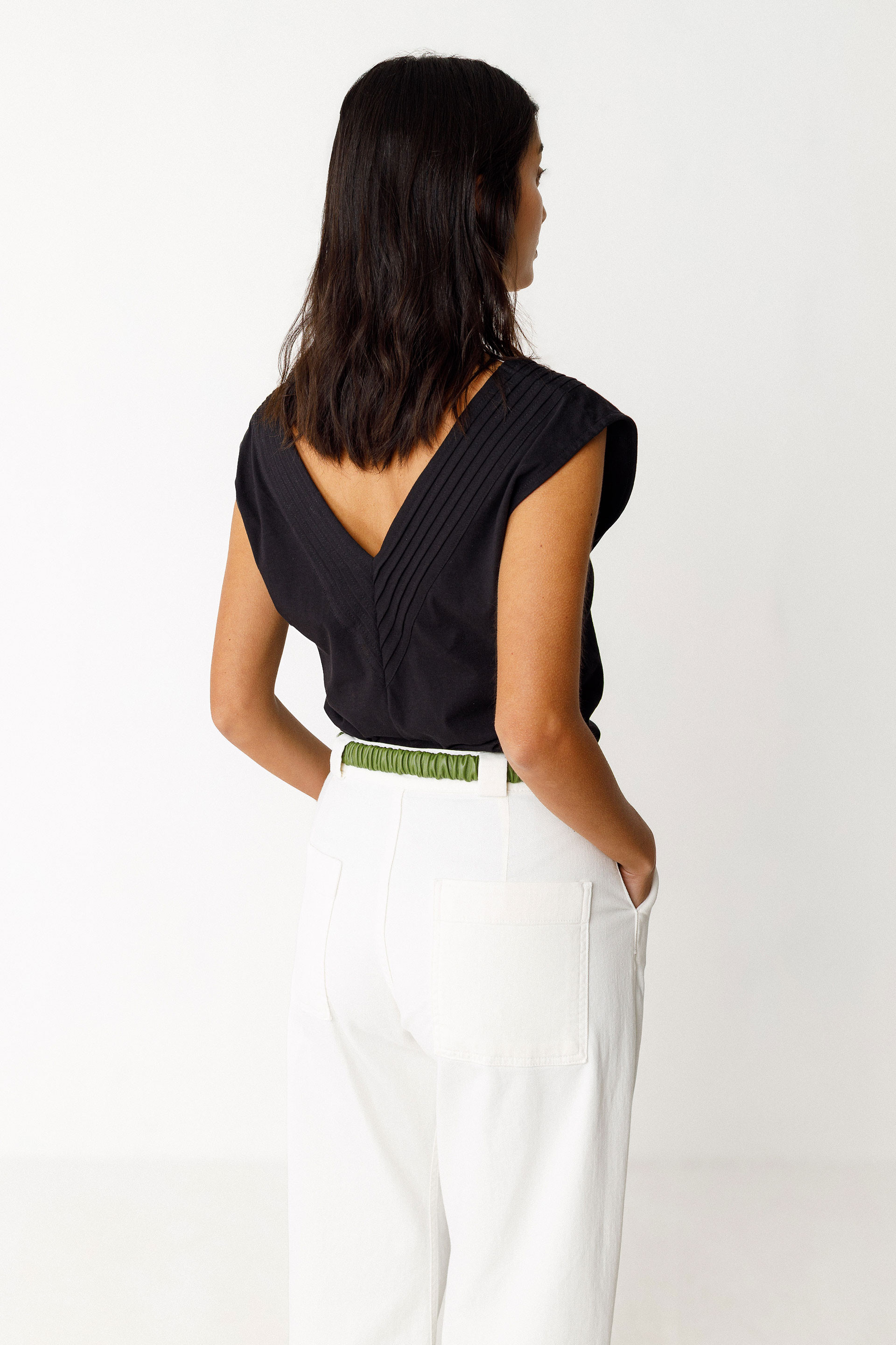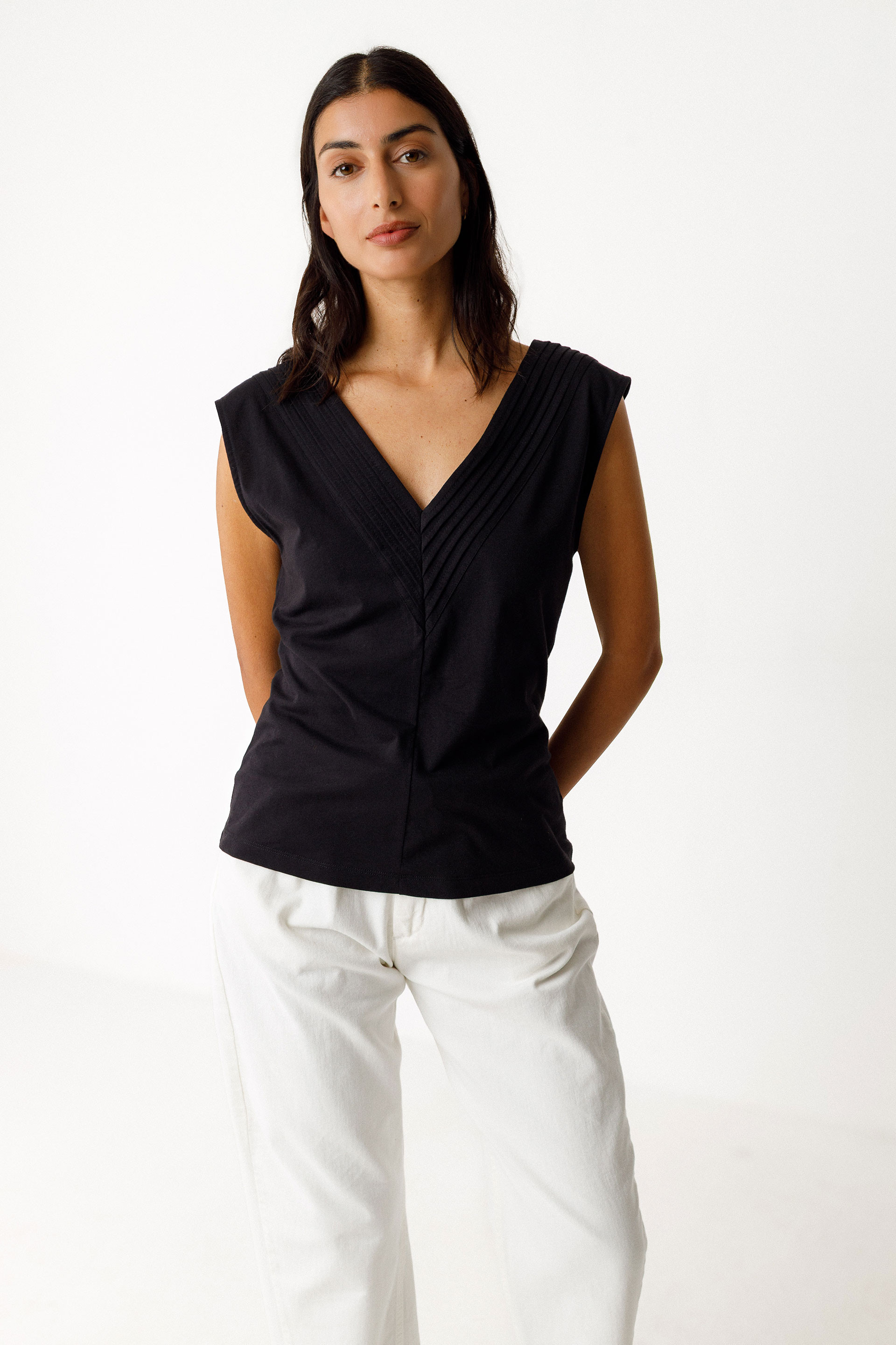 Haut sans manches à col V en coton biologique certifié GOTS. Coupe droite et détails plissés à l’encolure.