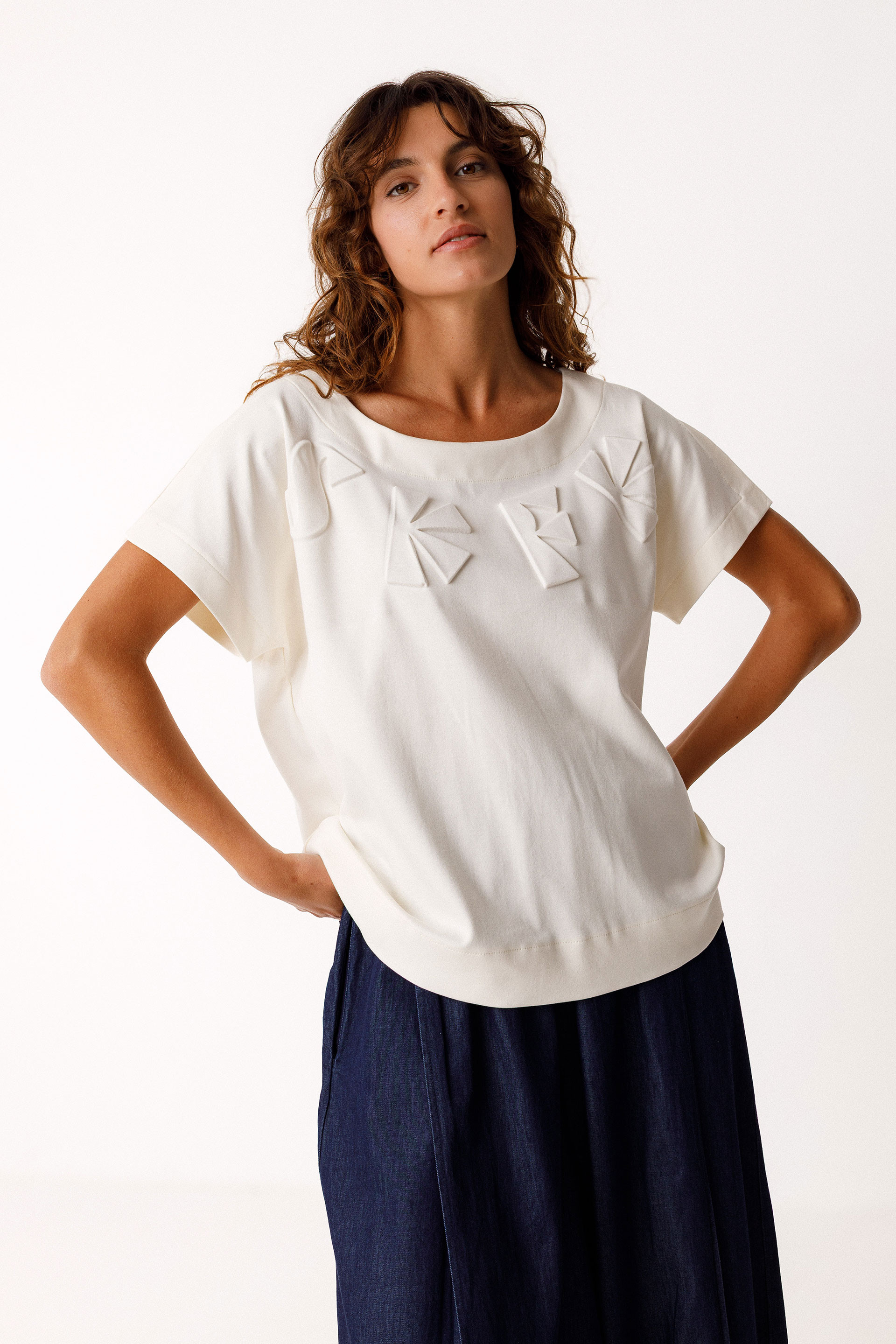 T-shirt à manches courtes avec une encolure arrondie et une petite découpe décorative à l’encolure au dos. Coupe droite.
