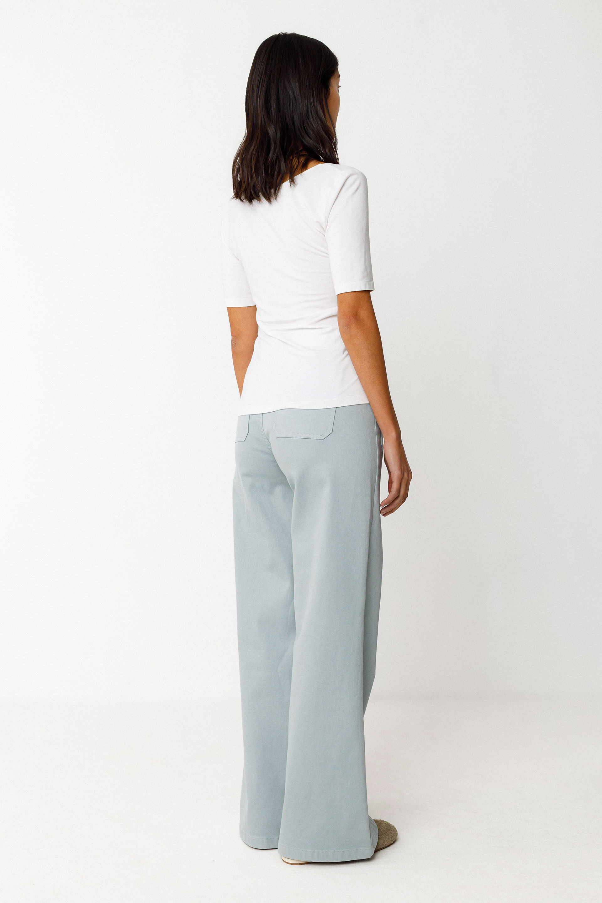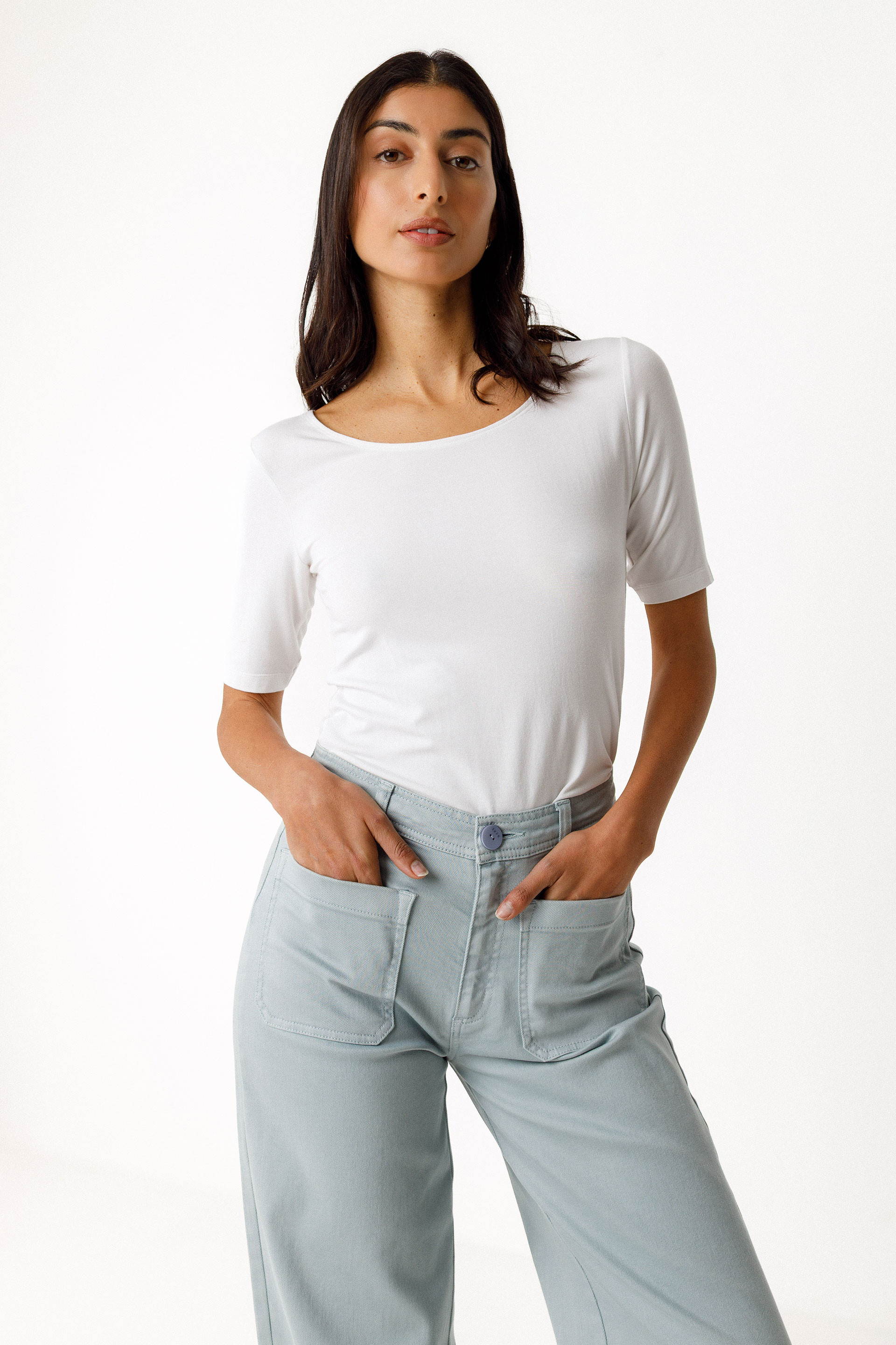 T-shirt à encolure arrondie et manches courtes, longueur classique.